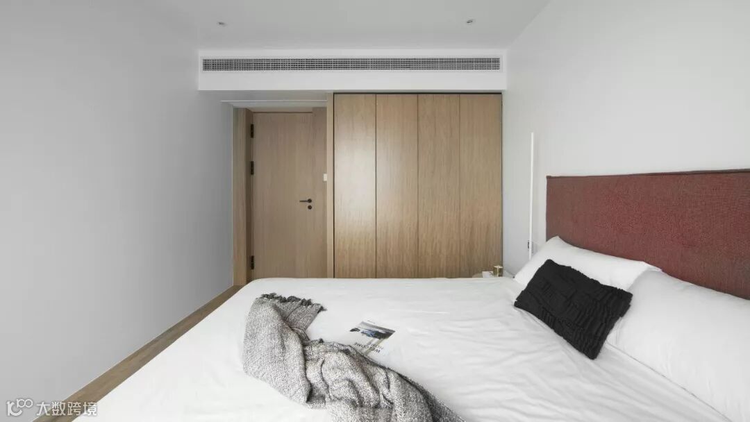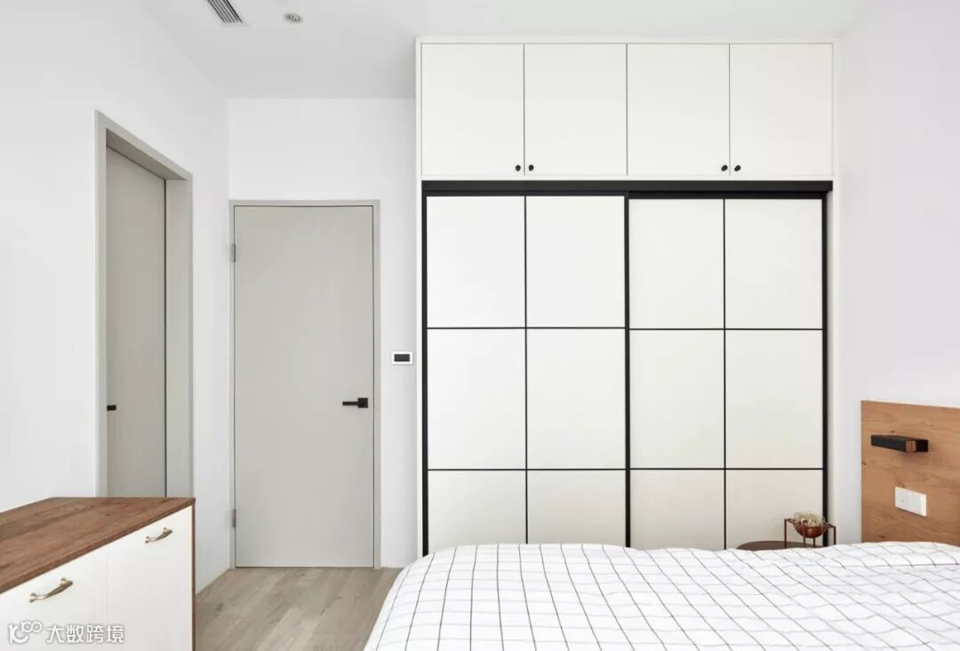 衣柜直接到顶的同时,若整个卧室户型允许时,可采取将柜体完全镶嵌在墙壁里面的设计,使柜子与墙面融为一体,让卧室看起来更宽大,也更简洁。