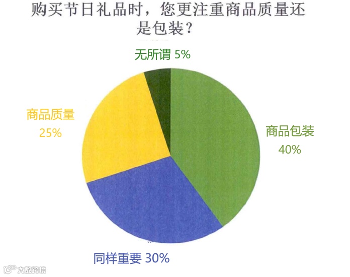通过对消费者购买礼品的调查,我们可以看出,有40%的受访者都认为商品的包装比商品质量更重要,有25%的受访者认为商品质量更重要,有30%的人认为二者同等重要。