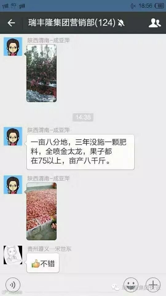 瑞丰隆集团快讯金太龙喷施肥又创奇迹!陕西蒲城的果农连续三年在自家的一亩八分地苹果树上使用金太龙,三年没施一颗肥料,全喷金太龙,果子都在75以上,亩产8000斤,而且苹果个头大,品质好,都是果农自己拍的图片。同时也再次说明:金太龙对克服果树的大小年有积极的作用。