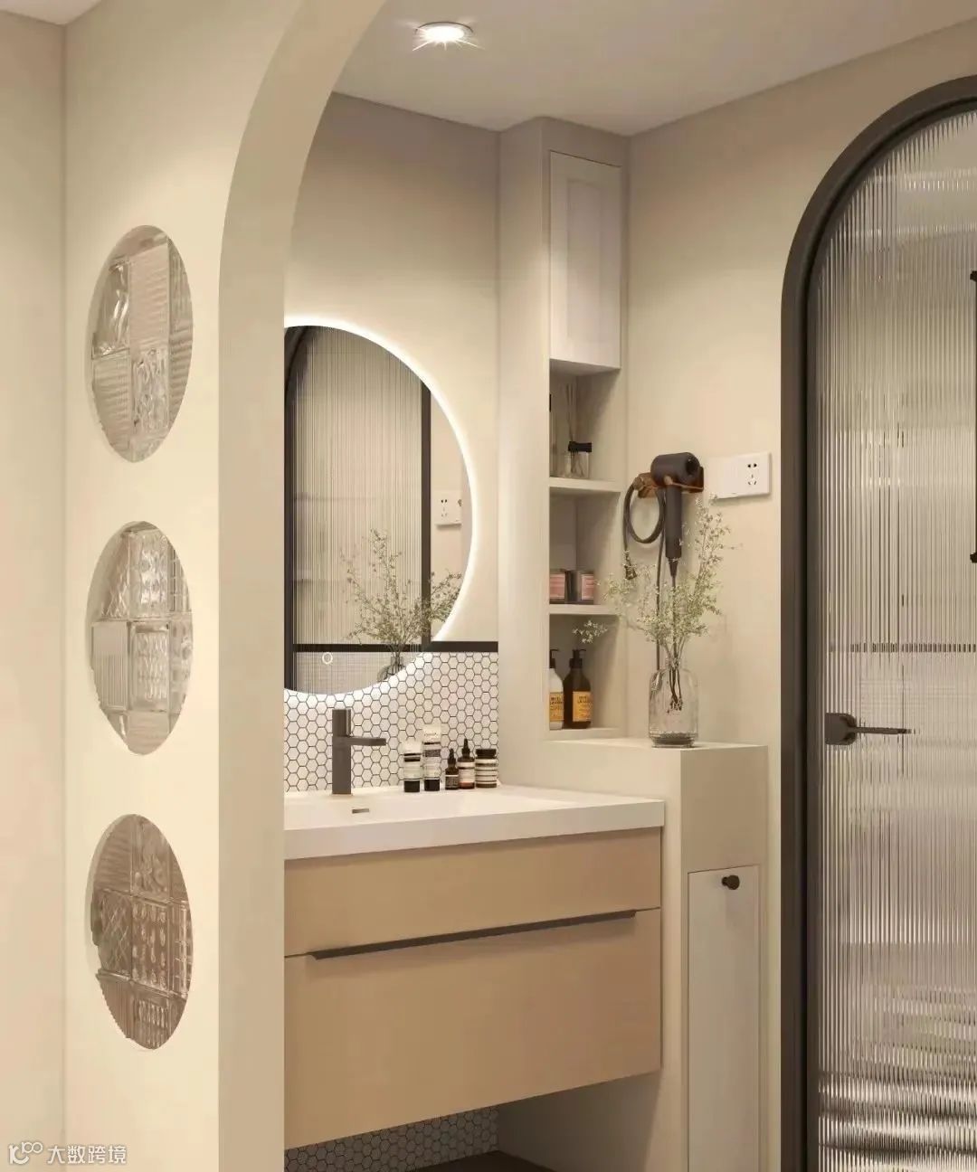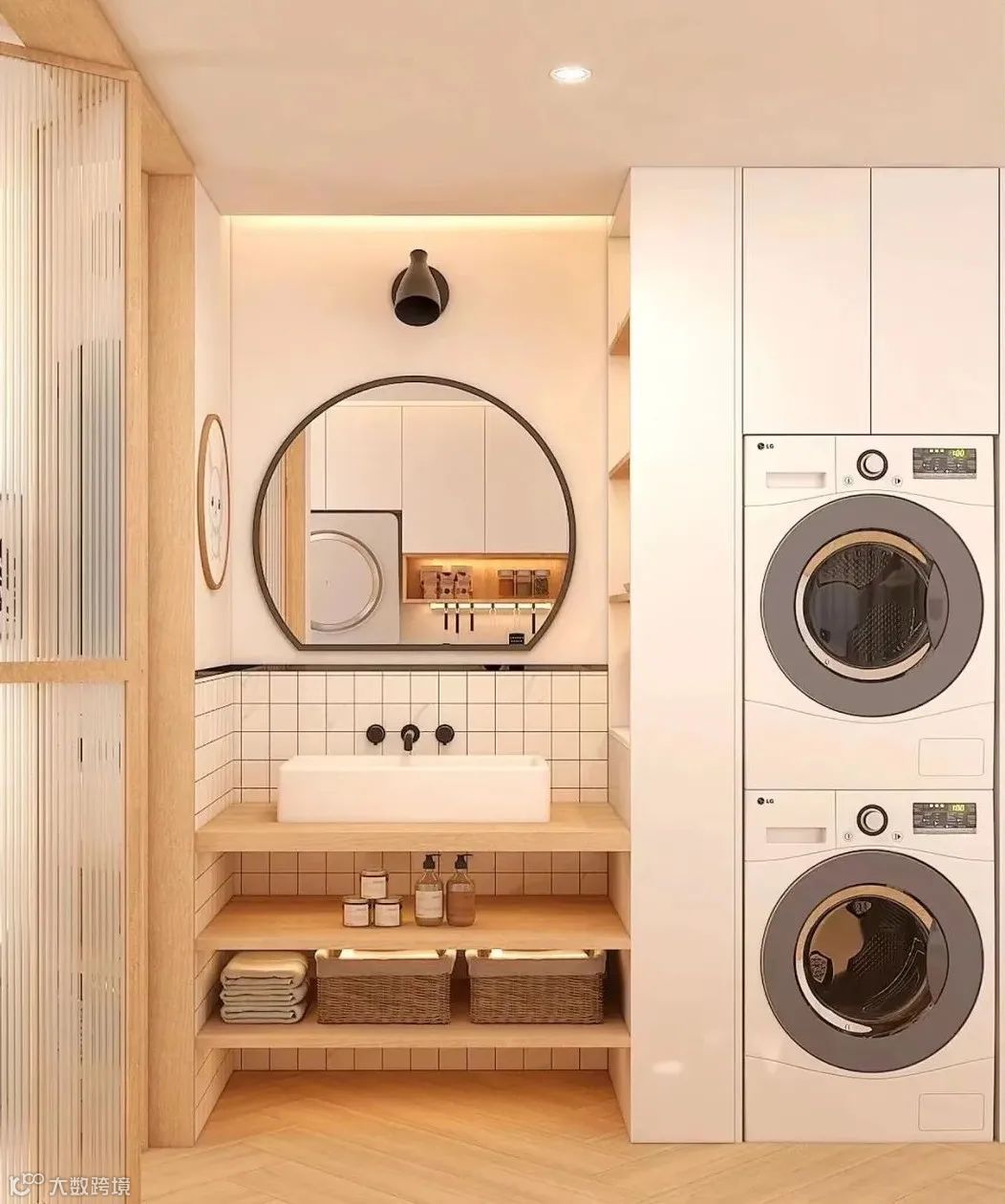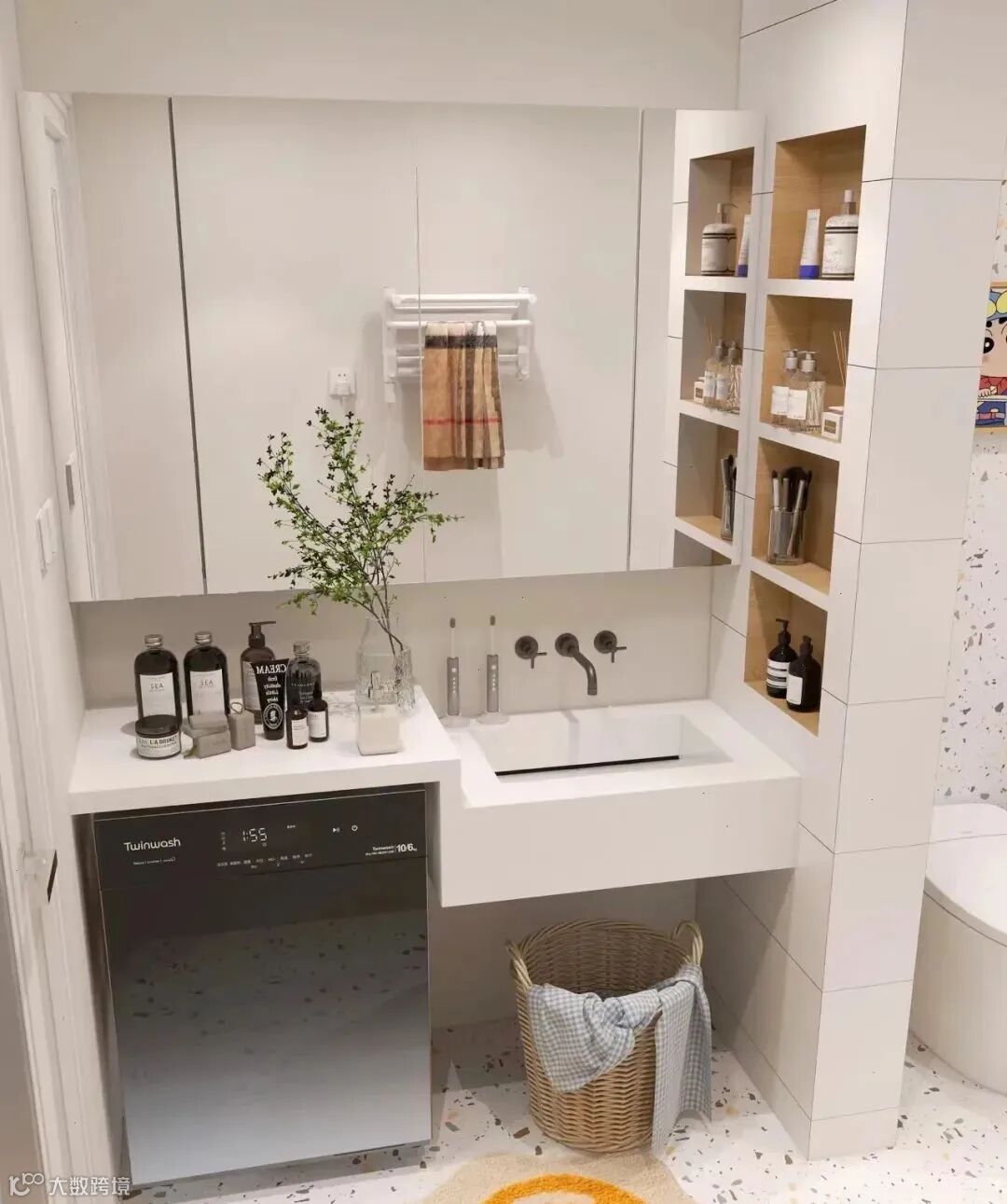 为了美观和后期的打理,我们可以选择好看的瓷砖铺贴洗漱区域,搭配智能镜面或者镜柜,洗漱台下面如果安置洗衣机烘干机,可以考虑在墙面设置壁龛,收纳日常洗漱用品。