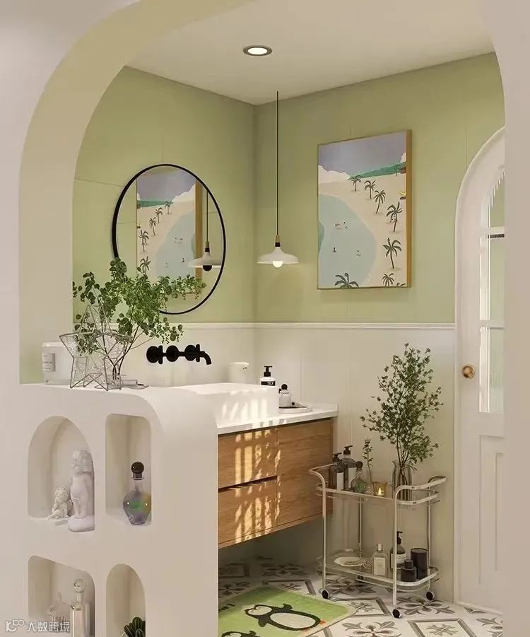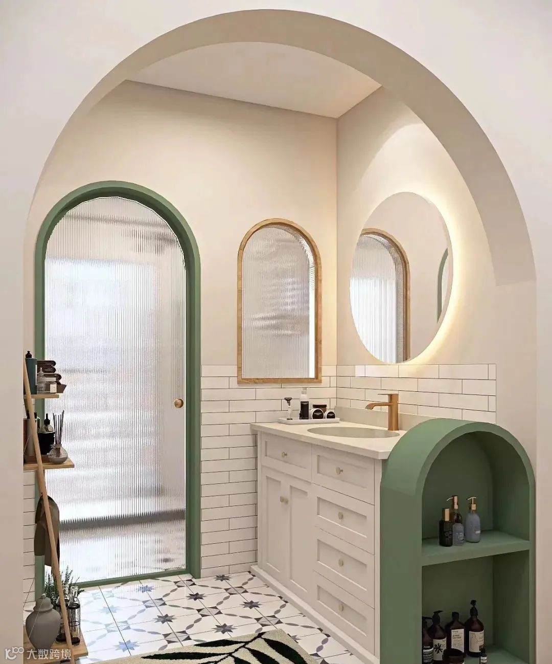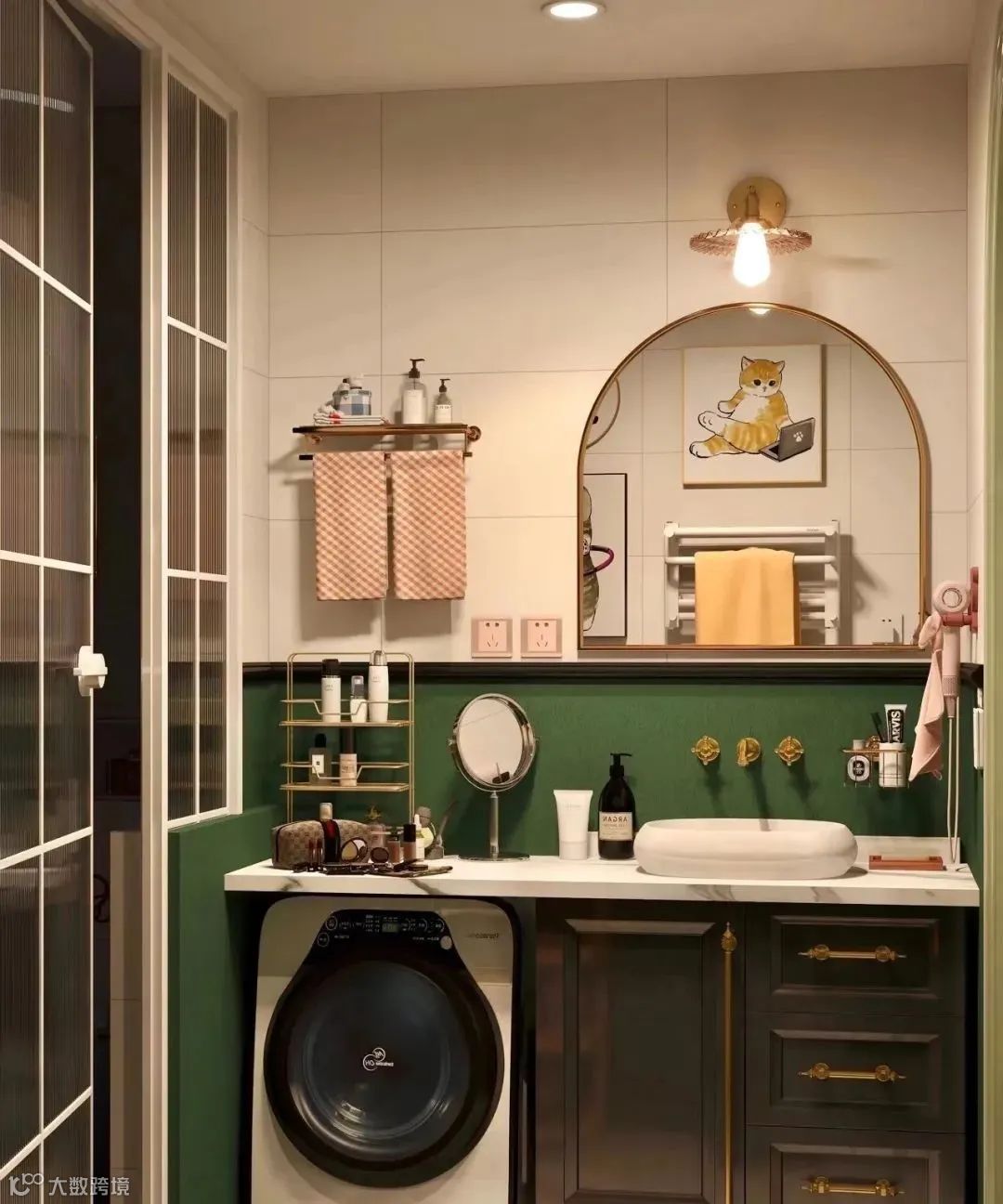 为了美观和后期的打理,我们可以选择好看的瓷砖铺贴洗漱区域,搭配智能镜面或者镜柜,洗漱台下面如果安置洗衣机烘干机,可以考虑在墙面设置壁龛,收纳日常洗漱用品。