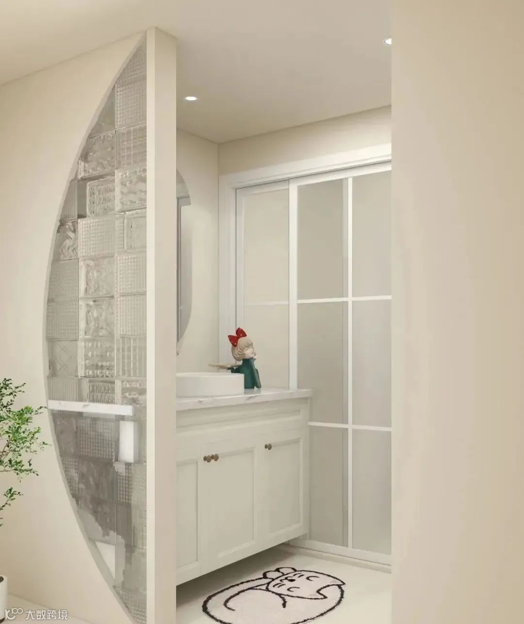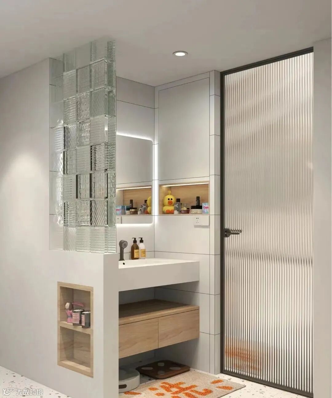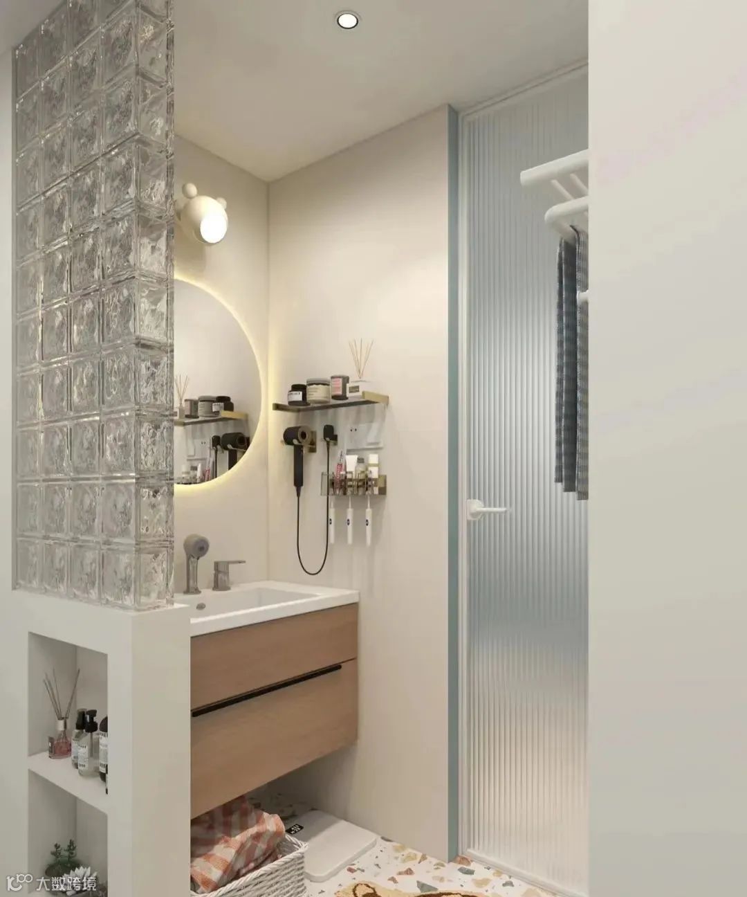 大门正对卫生间,建议试试用玻璃砖+半墙隔断,避免开门即卫生间的尴尬境地,玻璃砖透光但又能很好的保证家人洗漱的隐私,也让洗漱区的物品有效遮挡。