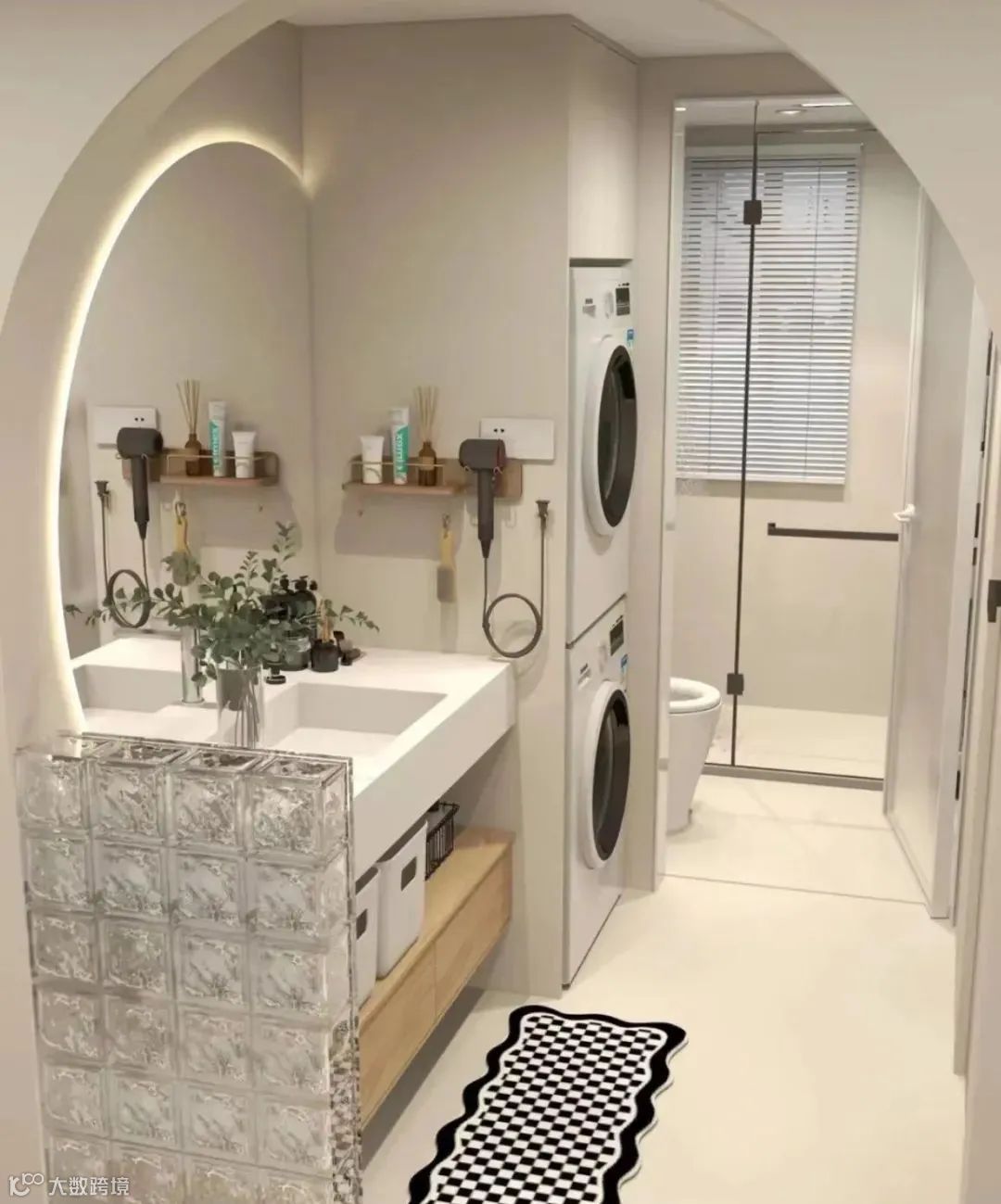 隔断也可以用玻璃砖,它具有透亮不透光的特性,隔断墙与它“相加”,虽不一定“华丽”,但是很有氛围感,在外移的空间里,将洗漱台与洗衣区并排一字型布局,洗衣机叠放,即使房子面积不大,也照样能够实现洗衣房,解放阳台空间。