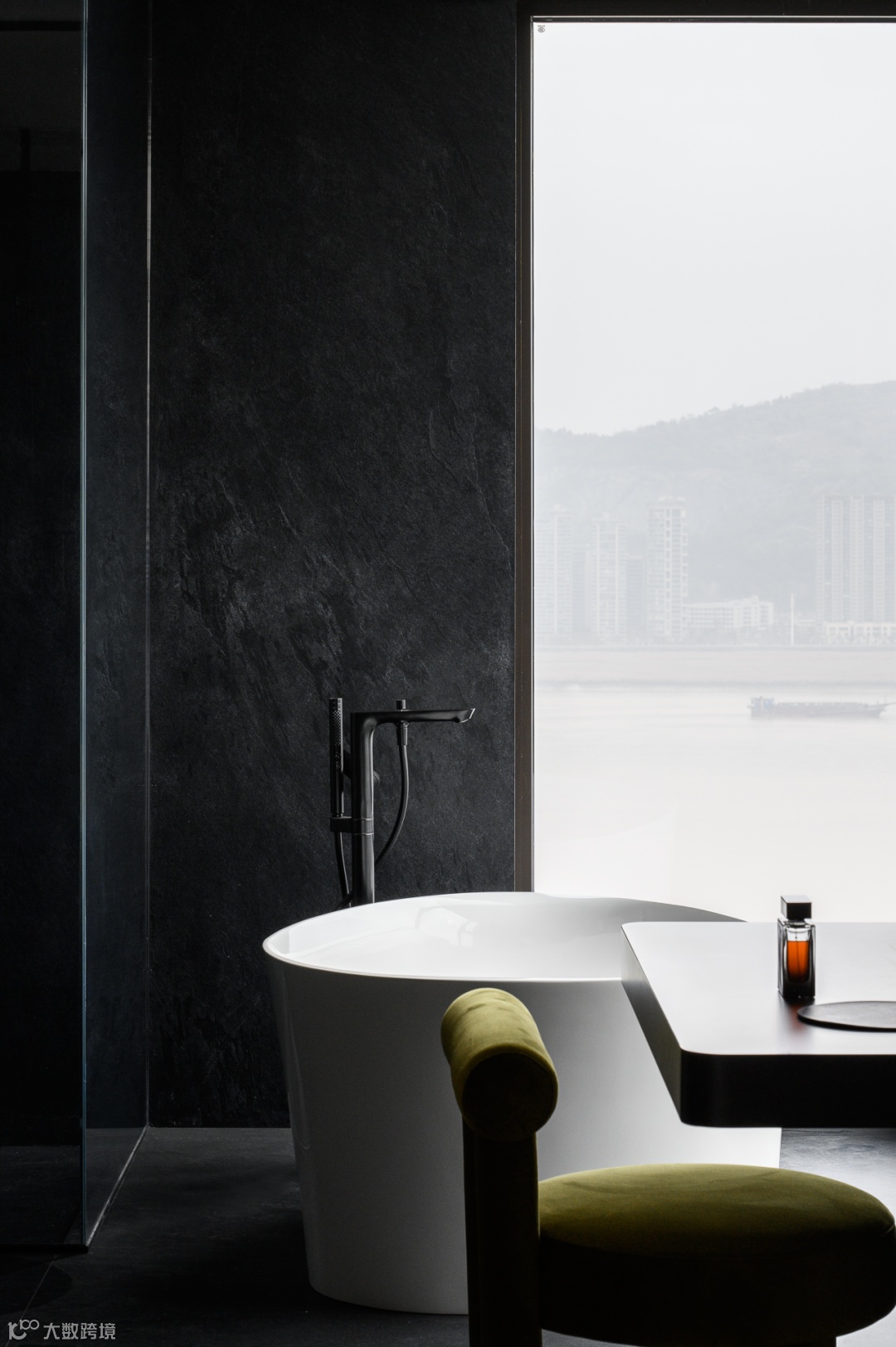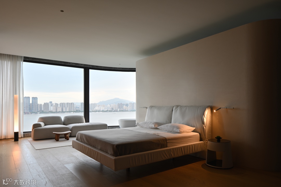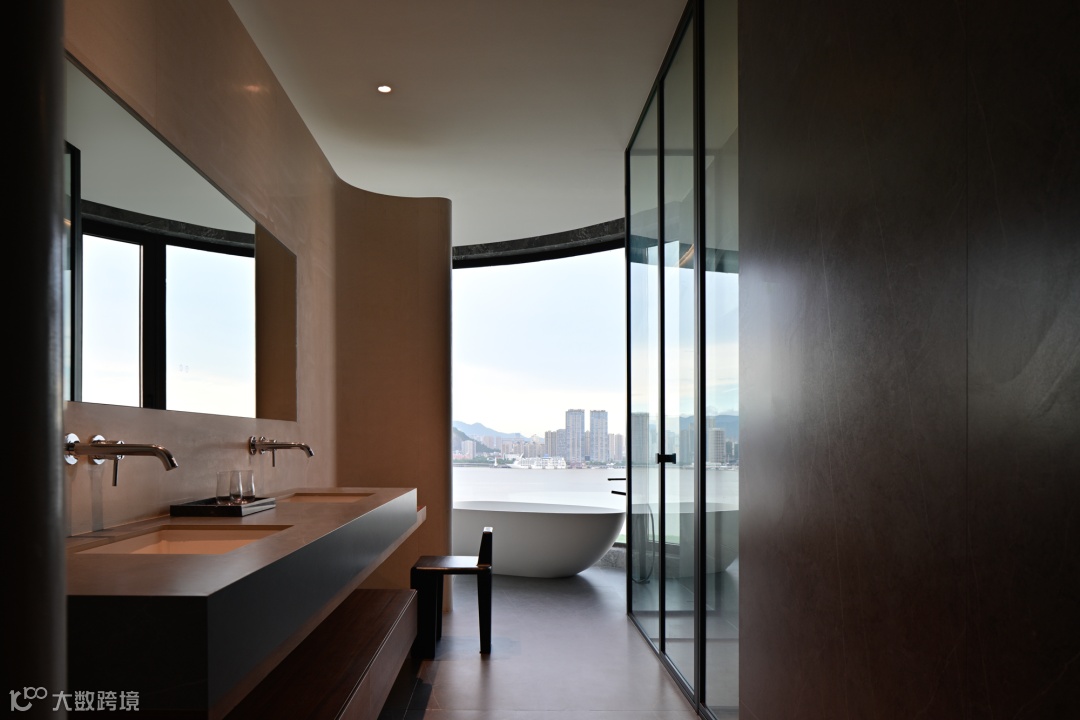 私宅空间的结构,本无定式。为环绕的江景不被打断,设计师大胆地打开主卧与卫生间的关系,将这连绵的江景恣意地引入空间,连绵的波光自由呈现。
