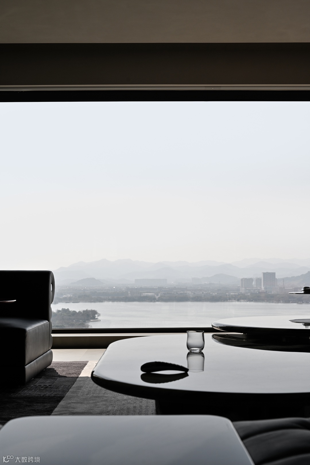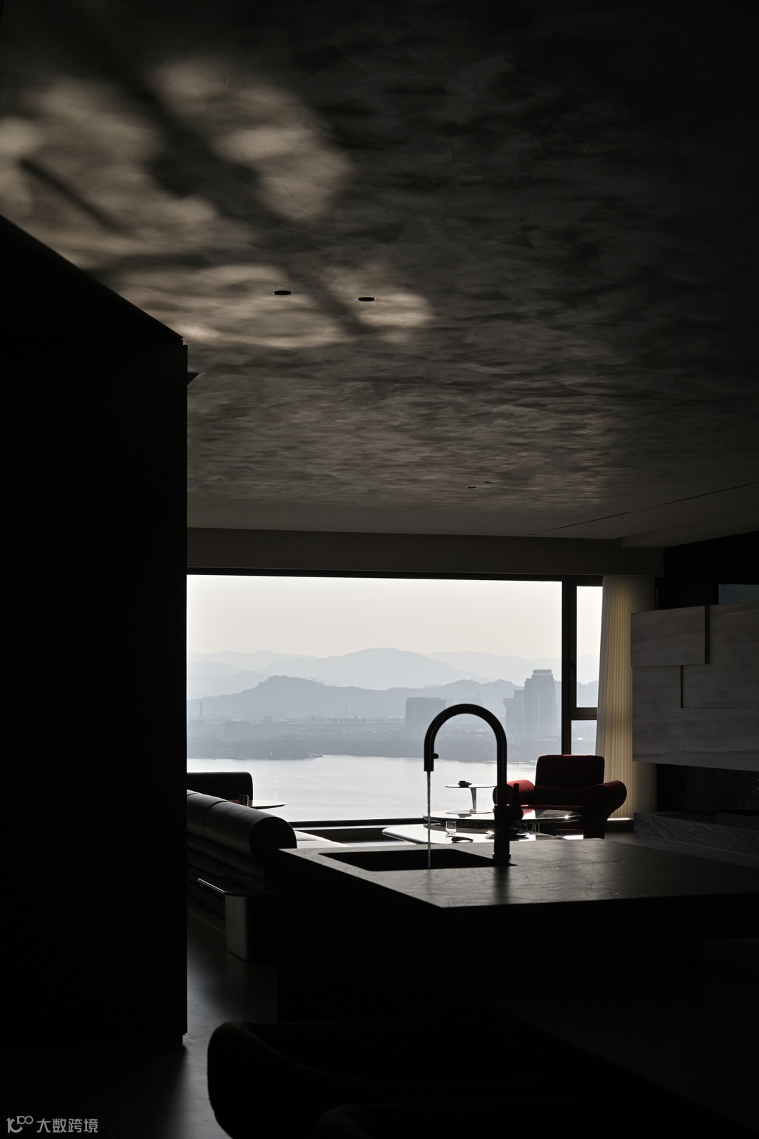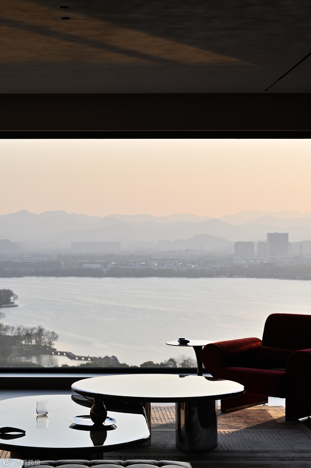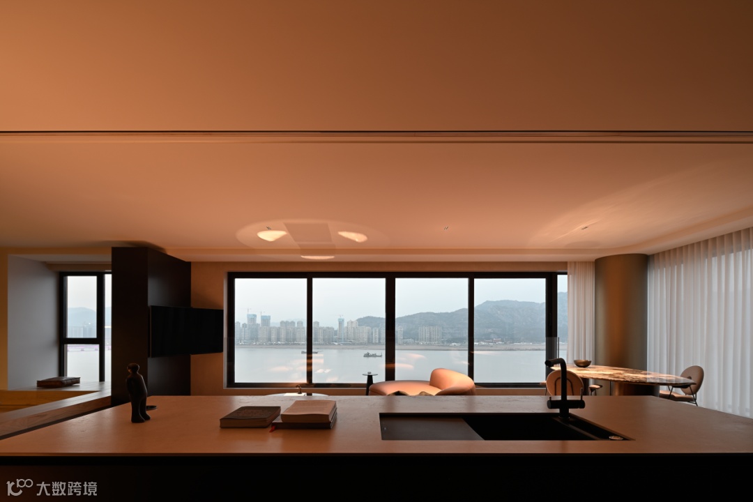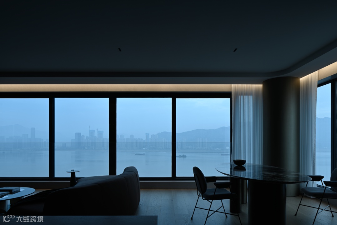 而至于城市的边界感,则来自于围绕整个空间的江水与山林。远处林立的高楼,蔚蓝的湖面,层起的山川与一望无际的天空……一日中最寂静的时刻,你于窗前落座,这山水也好,这都市也罢,早已融为一体。