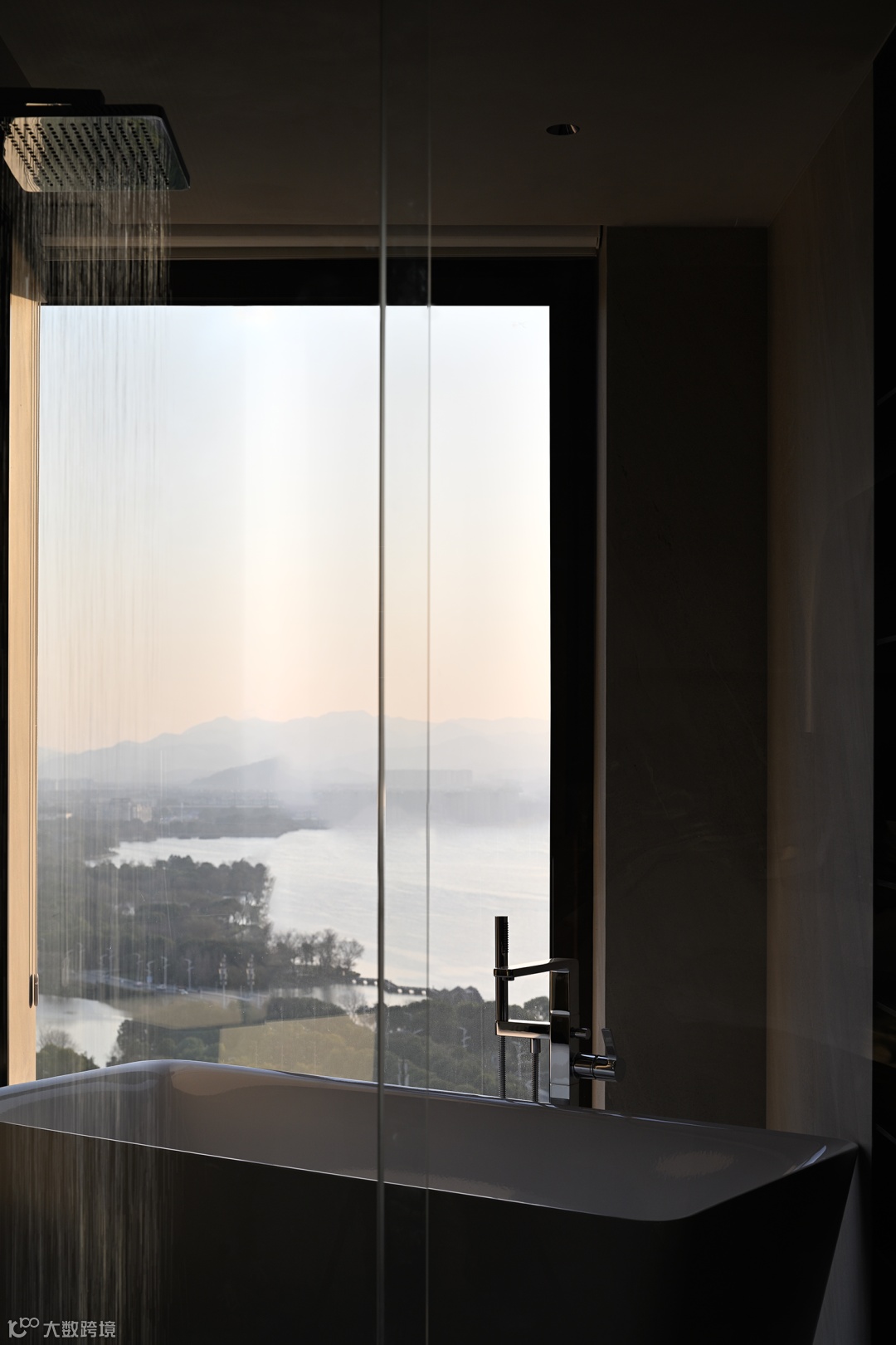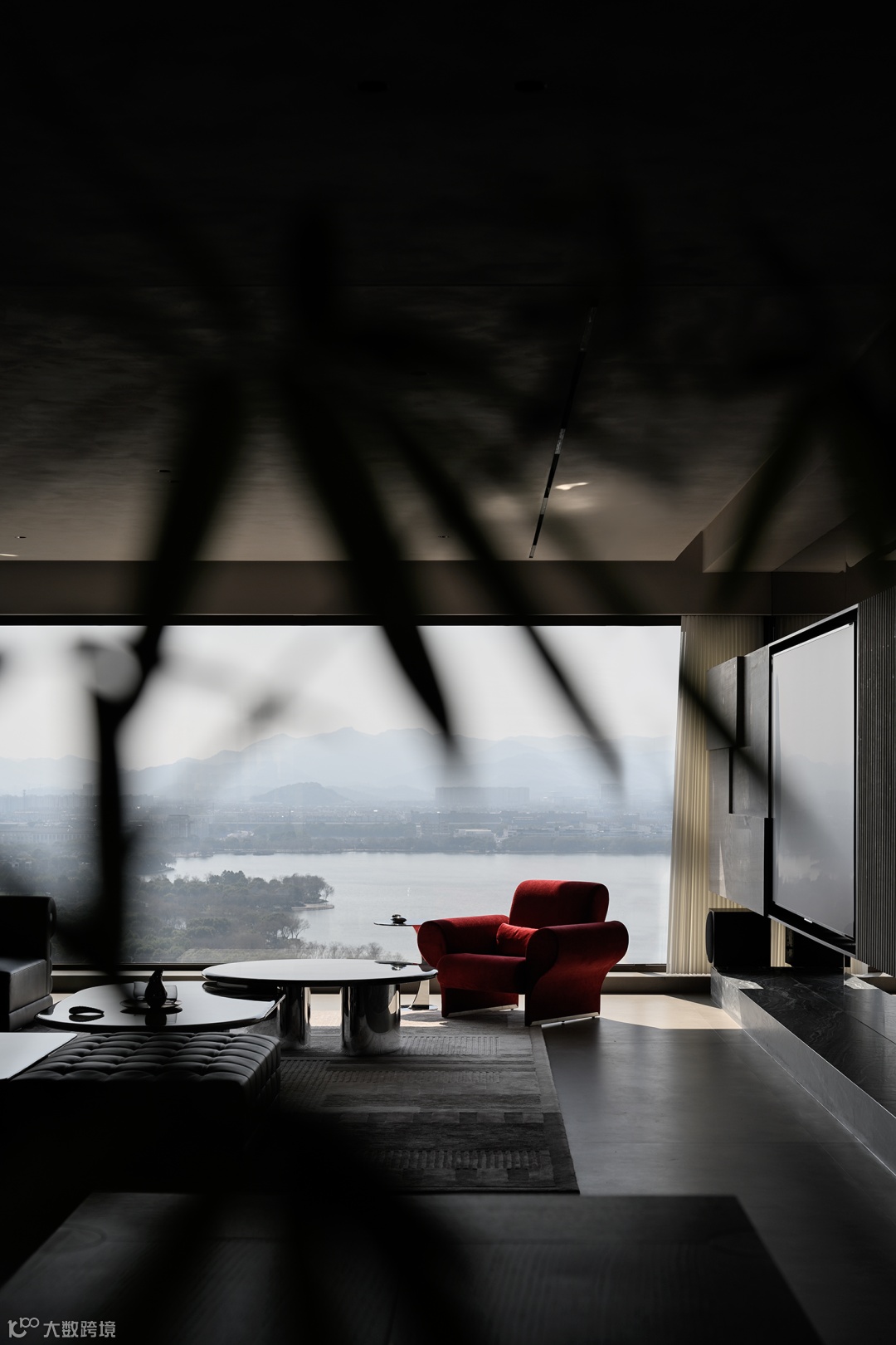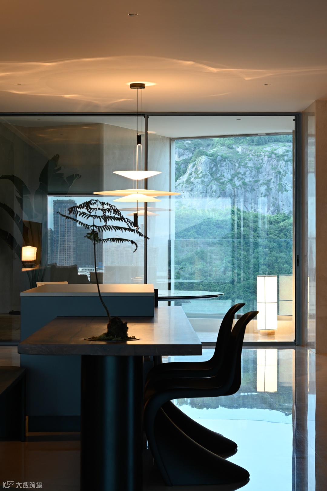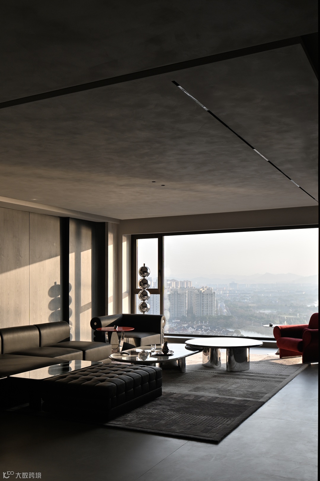 而至于城市的边界感,则来自于围绕整个空间的江水与山林。远处林立的高楼,蔚蓝的湖面,层起的山川与一望无际的天空……一日中最寂静的时刻,你于窗前落座,这山水也好,这都市也罢,早已融为一体。