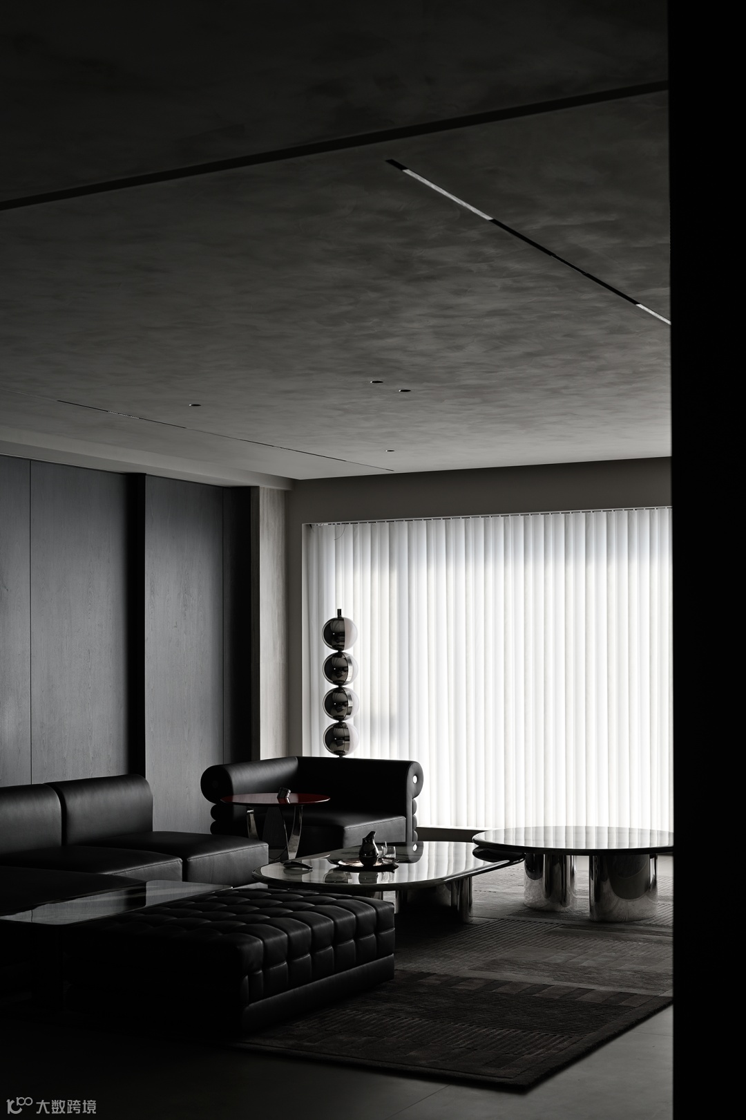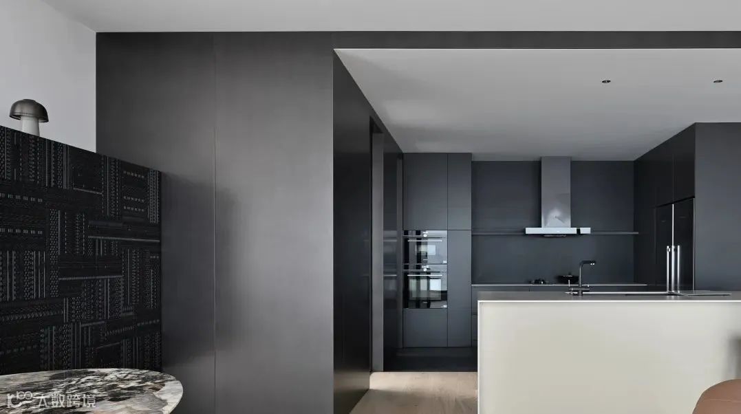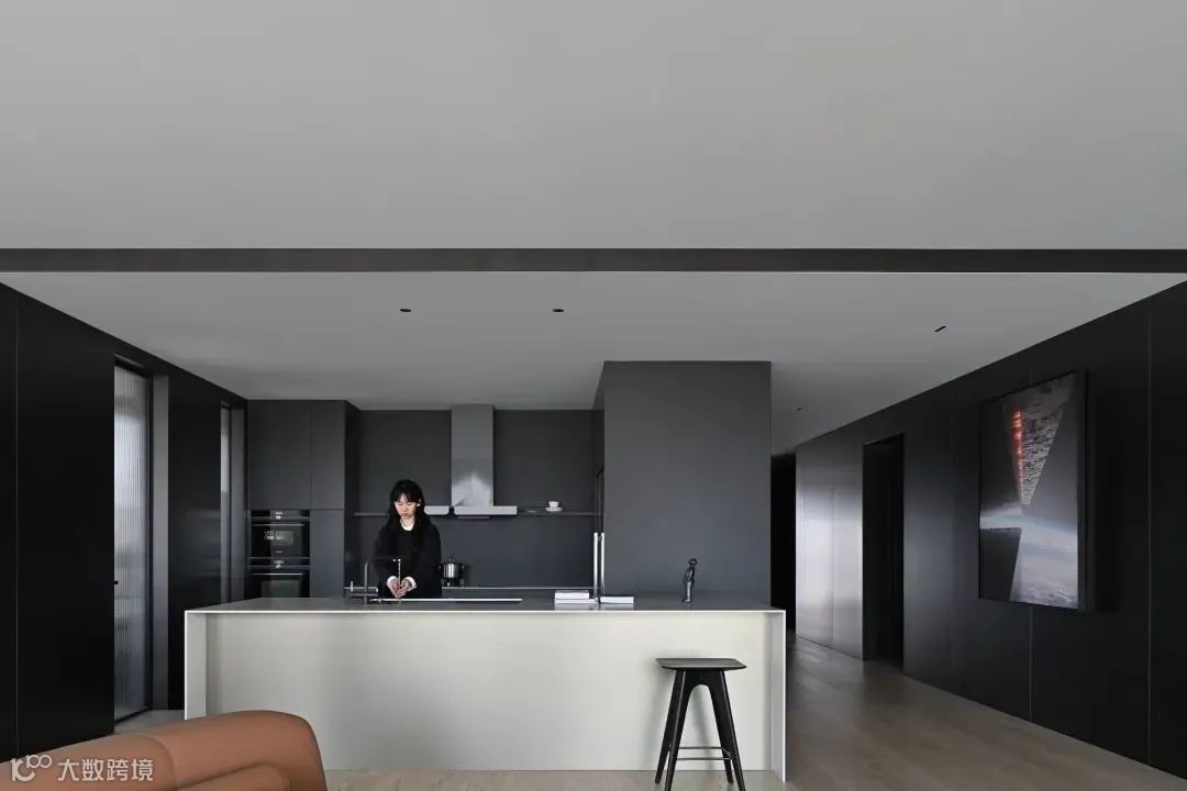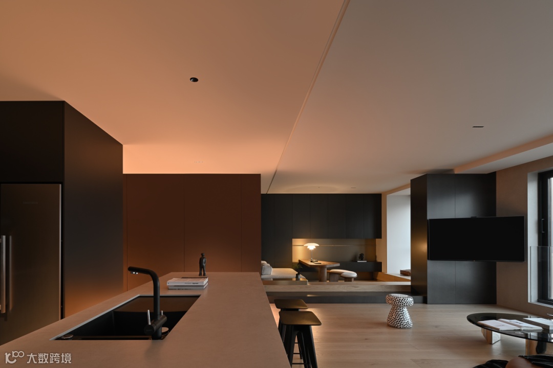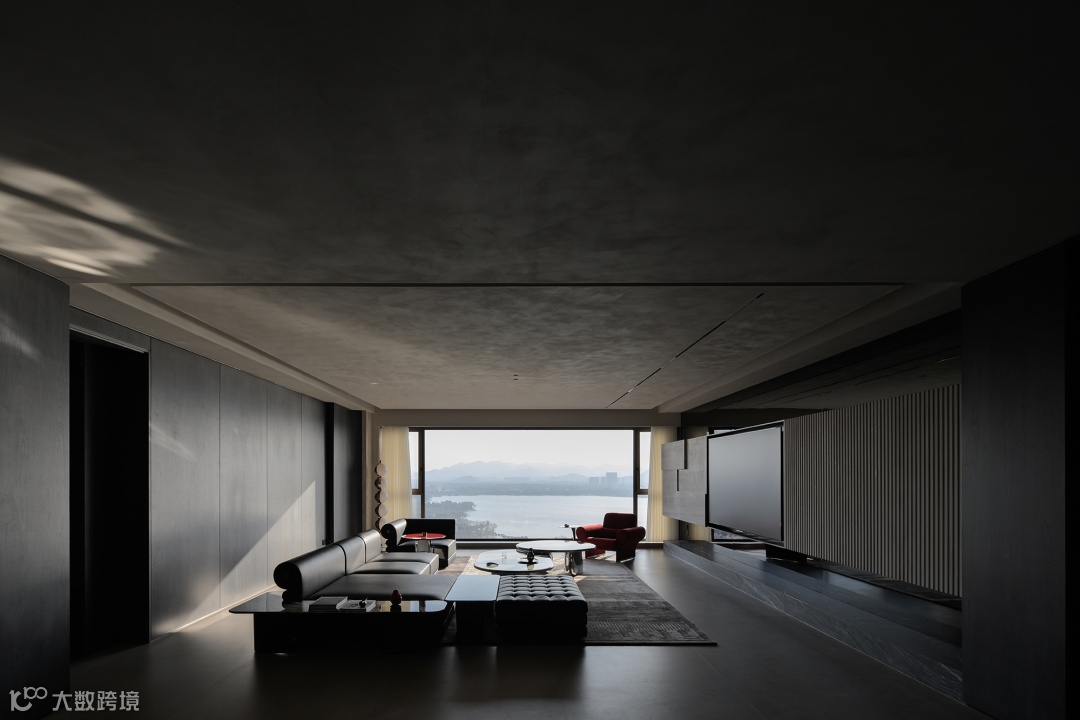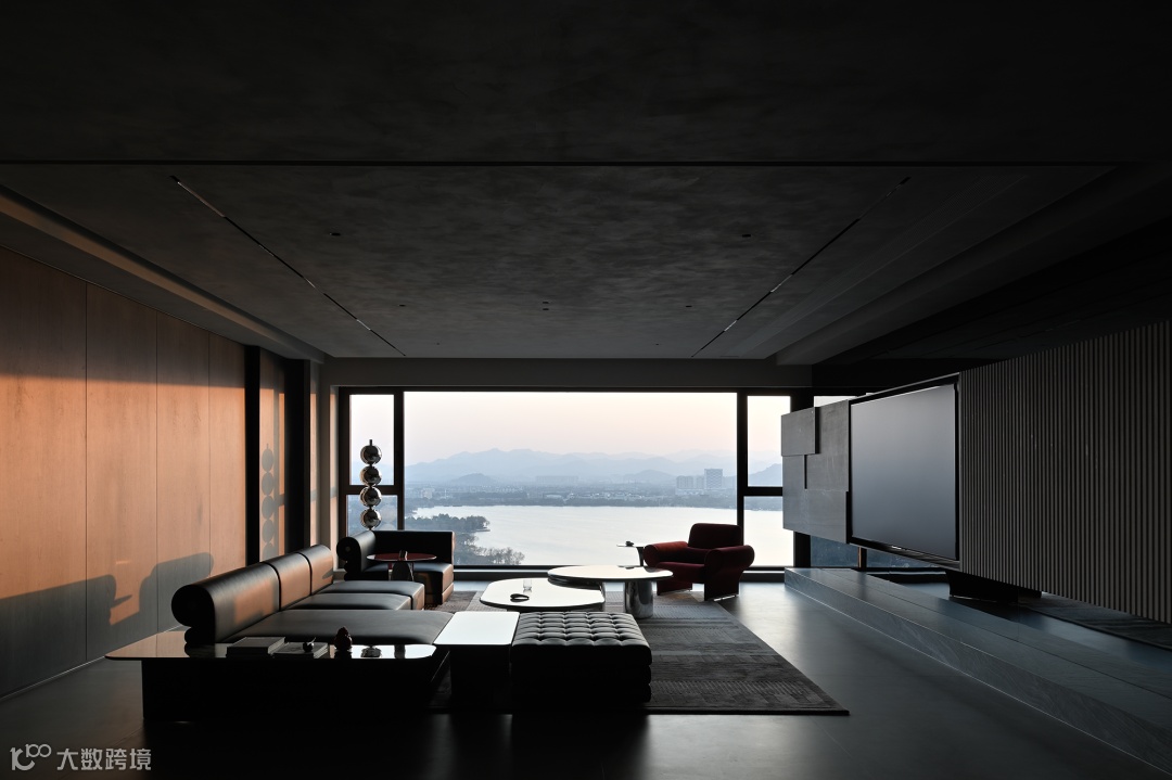 导台为链,串联起客餐厅间的对应关系。灰色起笔,黑色铺陈,落于眼中,是为沉静的艺术,两边皆为山水河畔,唯有这中间地带,以理性作为全部构成。自此,感性山水与理性建筑之间的界限破开,赋予空间动静相合之美。