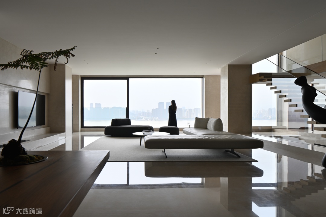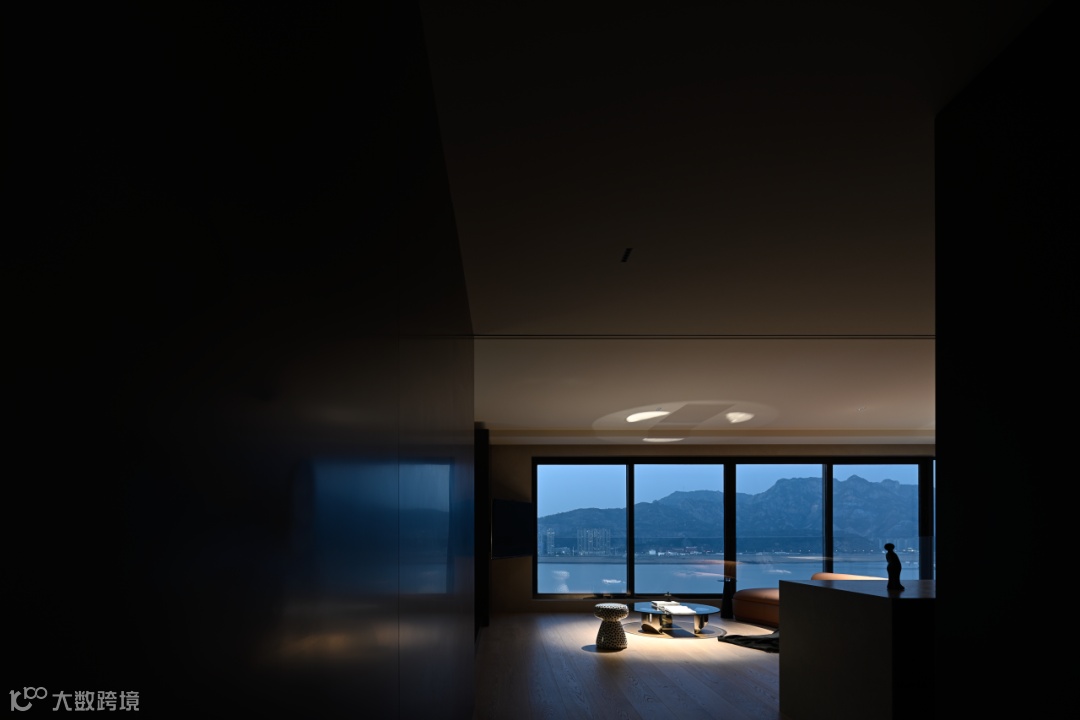 最大化的打开这层空间,让自然的气息流动,给光影轻灵穿梭的时机。从清晨,到日暮,水色韵韵,山色蔼蔼,光和影子从落地窗依依透入,