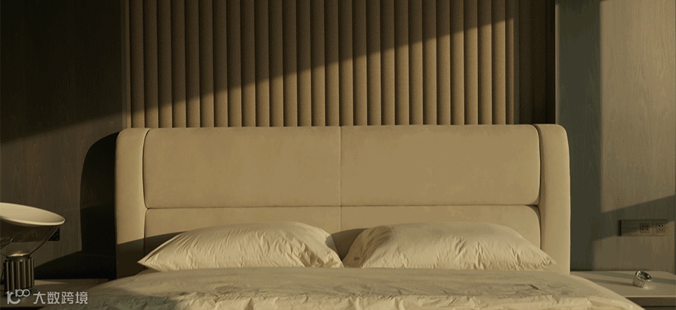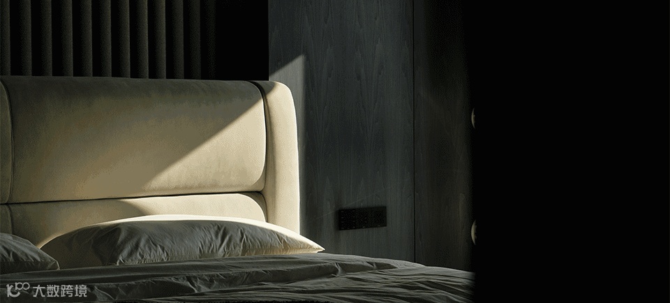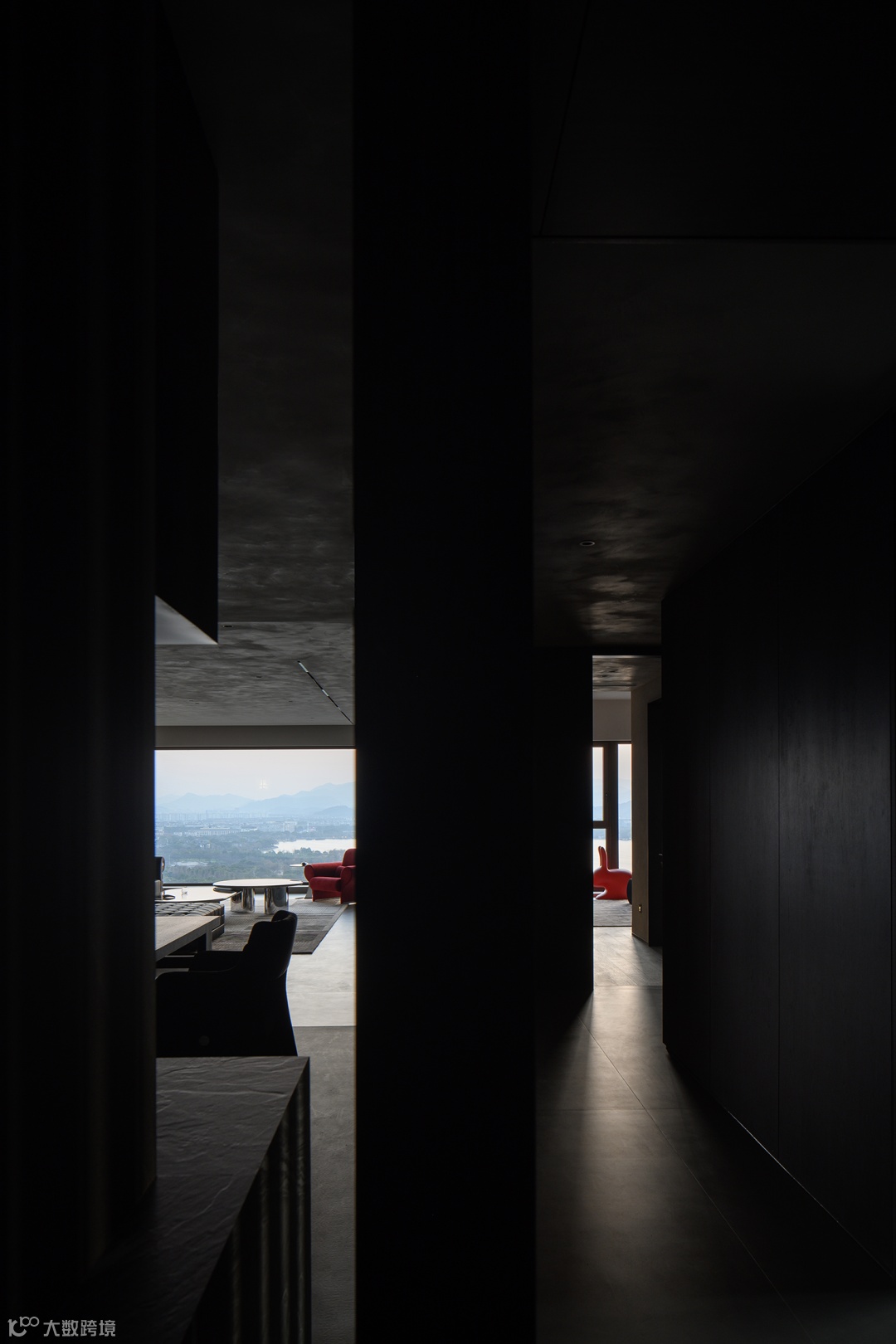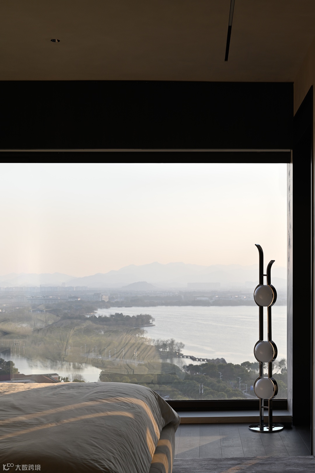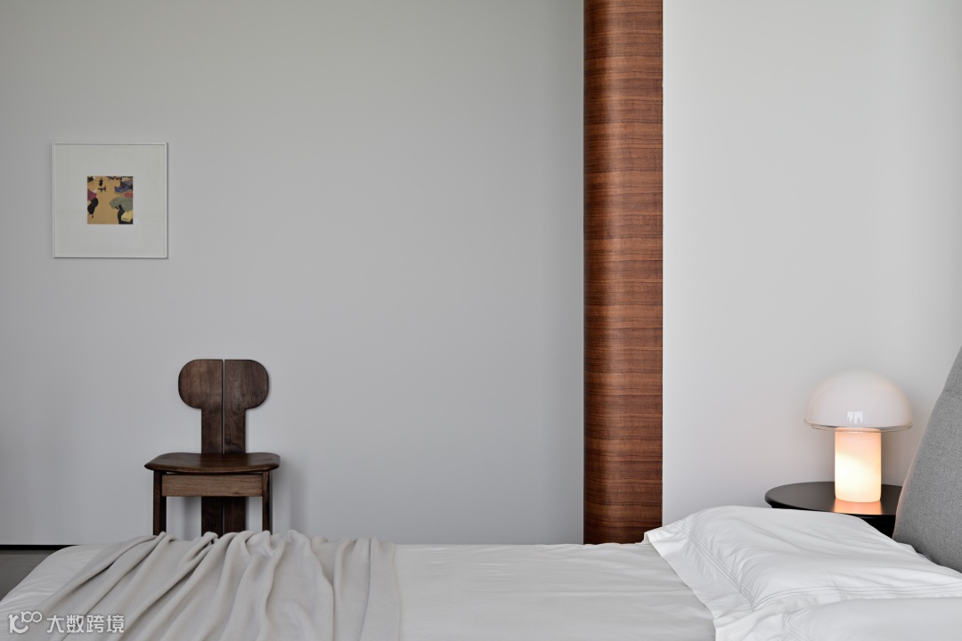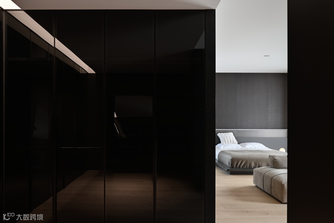 卧室场景取暗灰色调,水雾烟霞的外景对冲内饰的稳重气质,如临两种世界。当光线穿过窗柩,共生的介质在建筑中平缓流动。