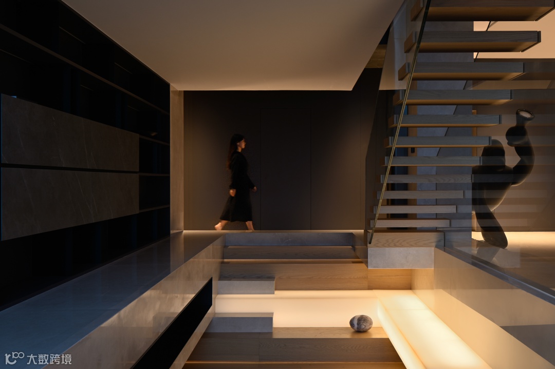导读:空间的主题落于项目中心的透明楼梯,在夜幕初降之时,楼梯的扶手仿佛消失于空气中,唯余步步阶梯,恍若悬空般层层而