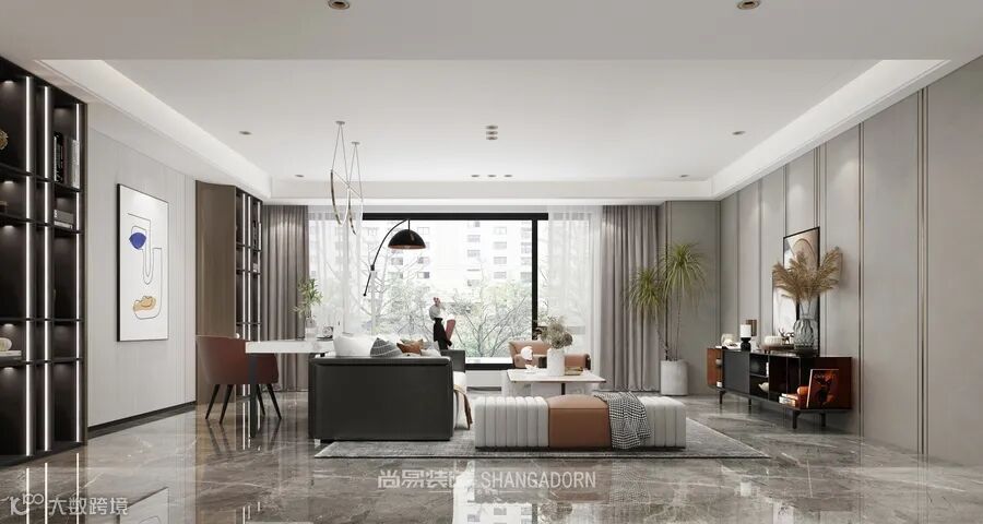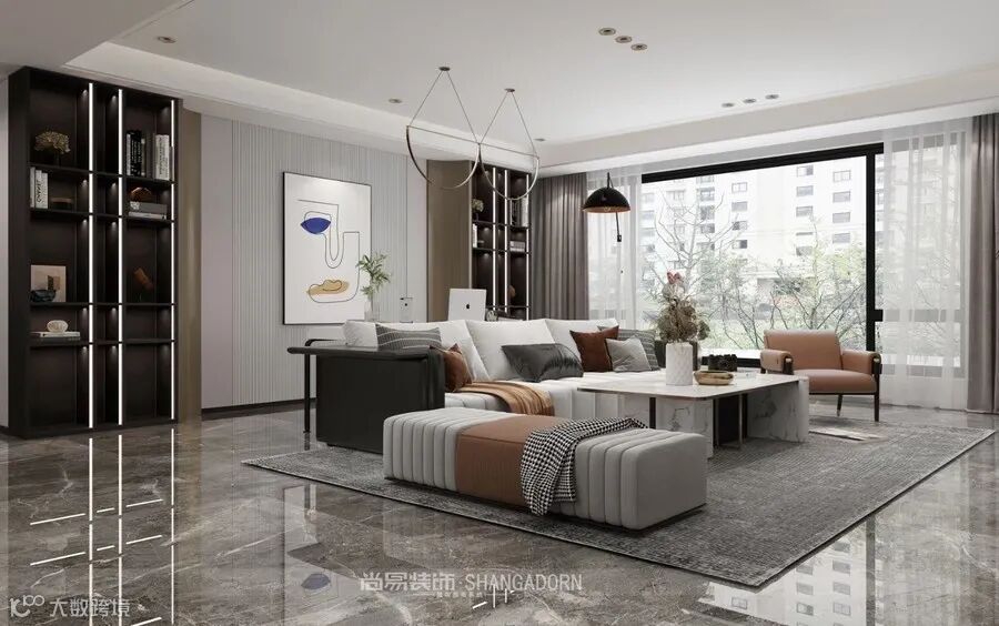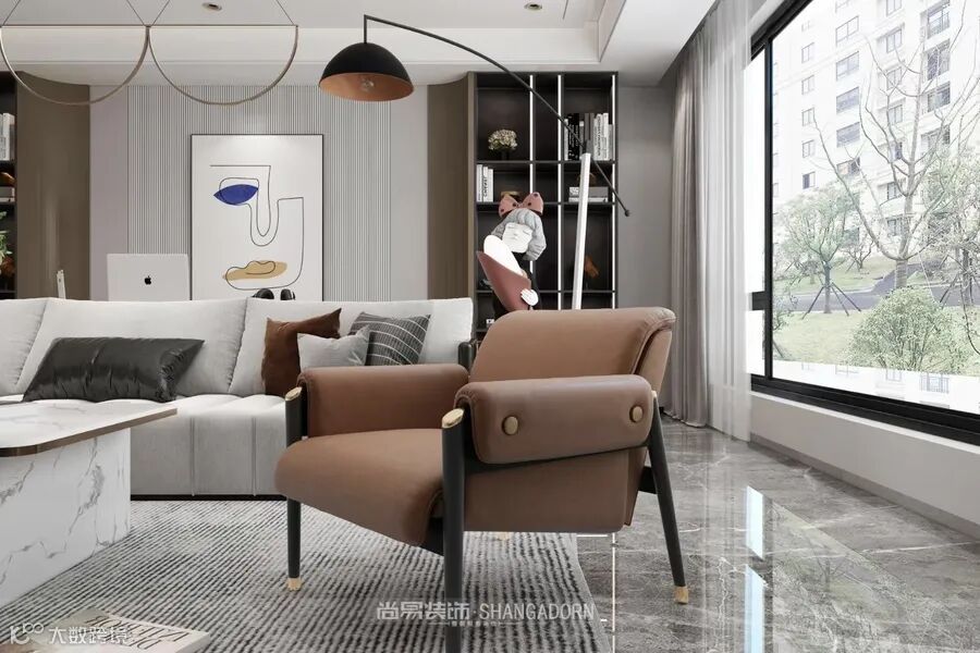 ▲米白色皮沙发,布置精致的抱枕,也展现出现代舒适的华丽感;沙发墙后方加入木色收纳柜+黑色书架,布置书籍与装饰品,现代而高级大气。