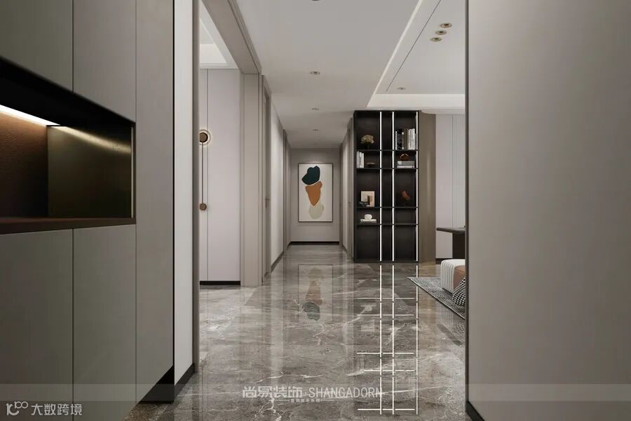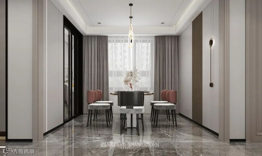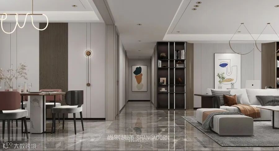 ▲客厅与餐厅空间相通,让居家空间更加实用而。整个客餐厅现代华贵的空间,过道位置以吊平的天花,两侧的金属环形吊灯,使得空间轻奢而又档次。