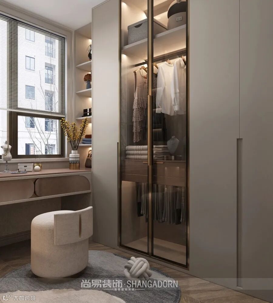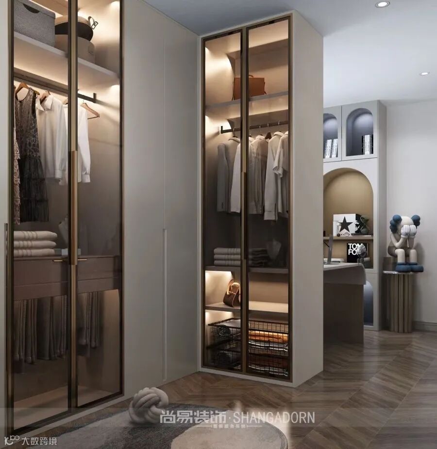 ▲在阳光映射下,沿用金属与玻璃材质的衣帽间,释放出干练型格与微妙张力。既凸显其本身的光泽与韵味,又保证了与套间的温暖联结。