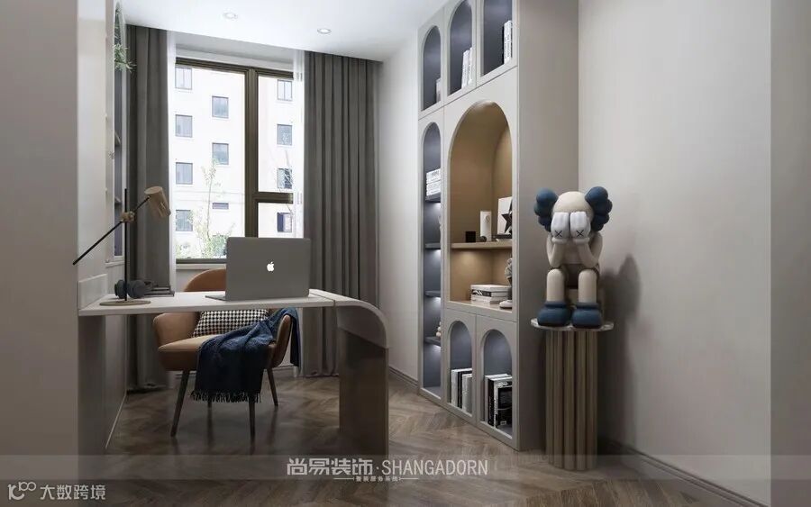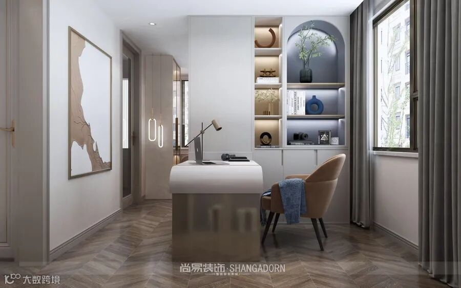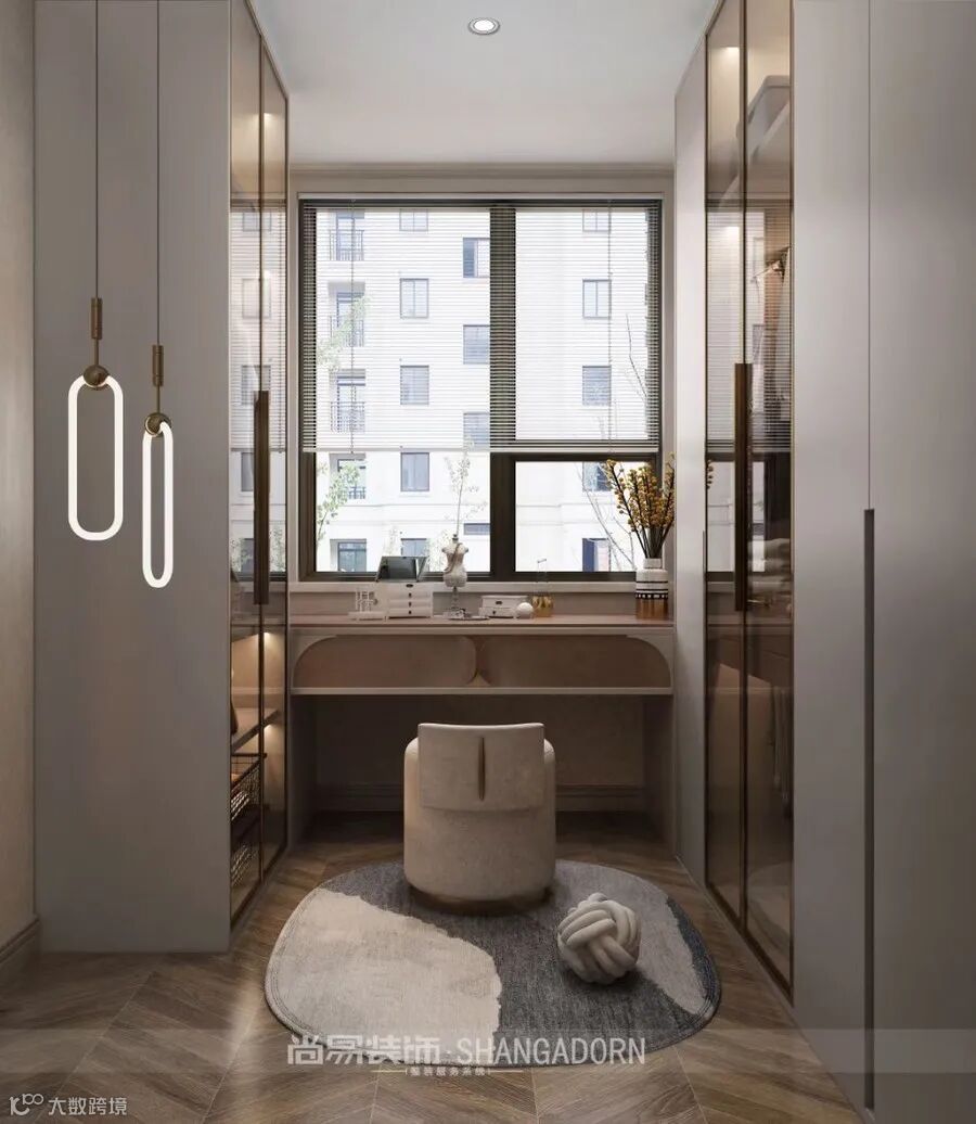 ▲衣帽间旁边面还有一个小工作书房,面积不大,以工作书台为主的布置,也是提供了工作加班的私密位置。