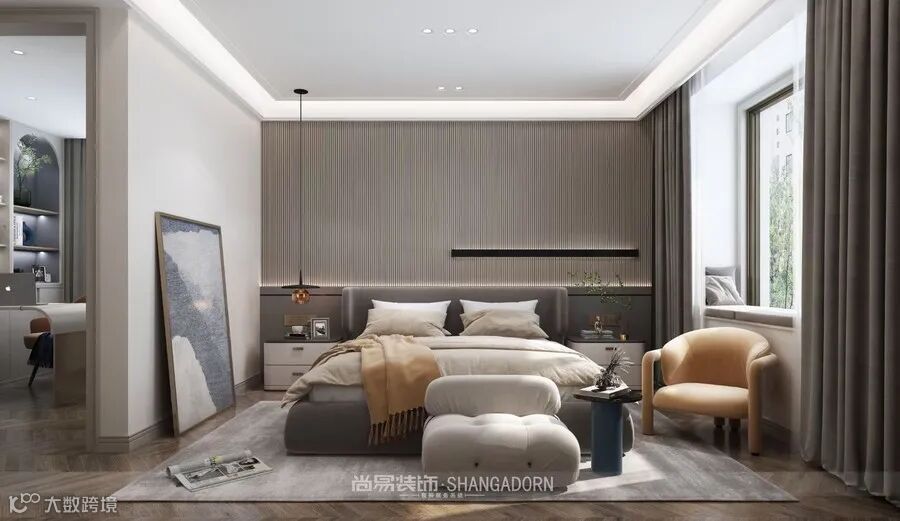 ▲主卧套间在开放的格局中,流畅地诠释出起伏的美感,各功能分区在交错延伸中创造出丰富而统一的设计语言,尽显精致优雅的样貌。