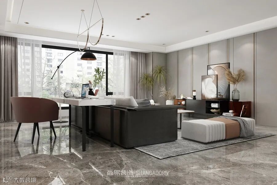 ▲沙发墙是硬包背景墙,在造型中间加入金属条装饰,挂一幅灰白调的装饰画,搭配米白色沙发啊,带来一个端庄华丽的优雅与舒适氛围。