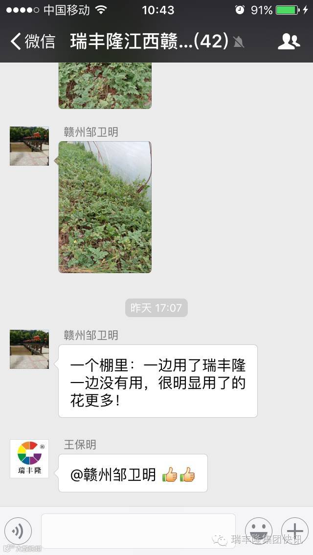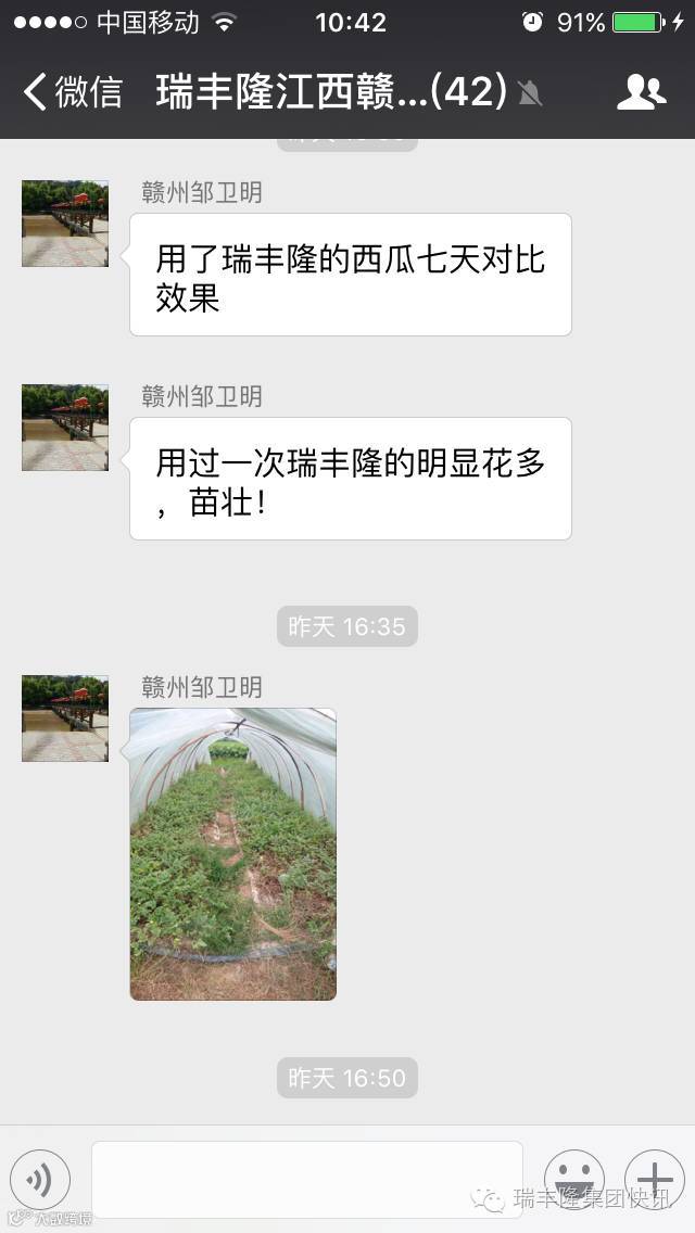 瑞丰隆江西赣州市场部在西瓜田里进行对比示范后发现,喷施使用瑞丰隆后,西瓜瓜秧长势壮旺,植株生长茂密比较均匀,瓜秧粗壮,明显好于对比田,叶片更厚绿,花多且花朵大。该示范户是一整个西瓜大棚,左右两边一边喷了瑞丰隆,一边没有喷施,七天后用户看到效果后表示:瑞丰隆喷施肥确实效果好!喷施了瑞丰隆的西瓜田生长很快,苗壮花也多!好肥料就是好肥料!