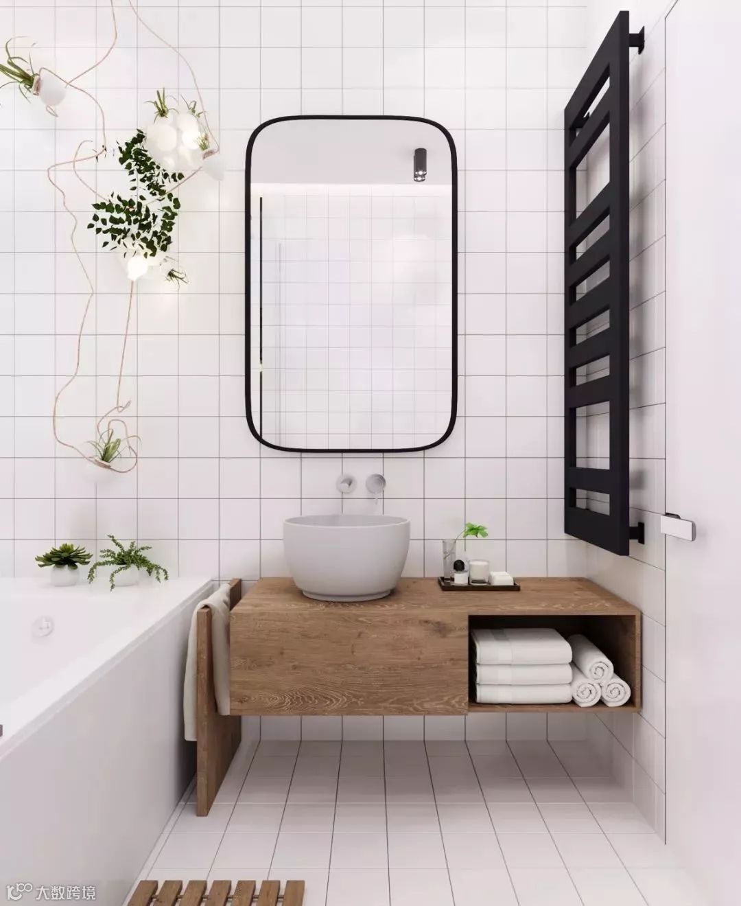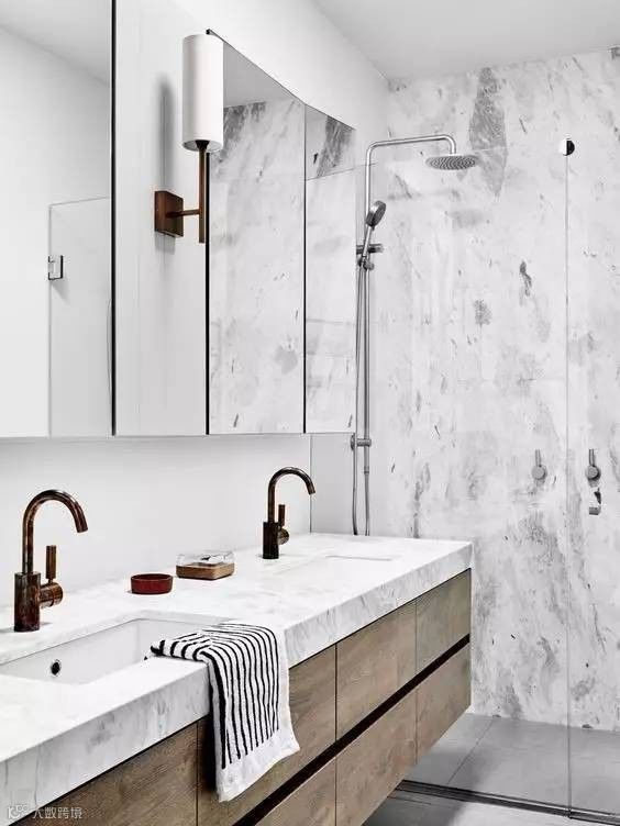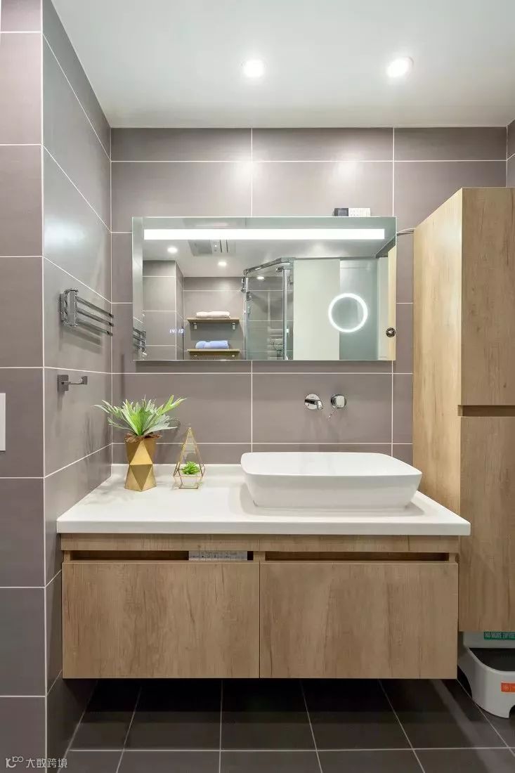利用大镜面+镜前灯来补充光源,就是一个非常实用的办法。一来可以打出均匀的光线,保证每个暗角都能充满光亮,二来也方便刷牙洗漱,最大化地弥补光线不足的缺点。