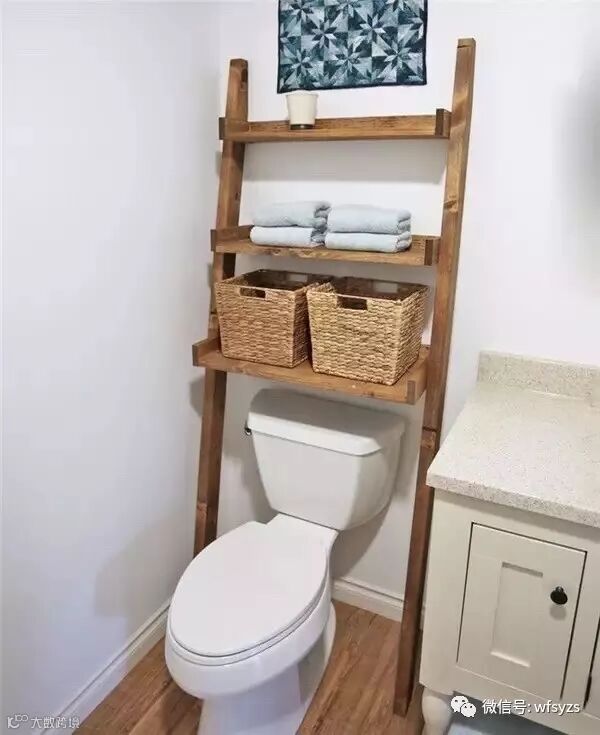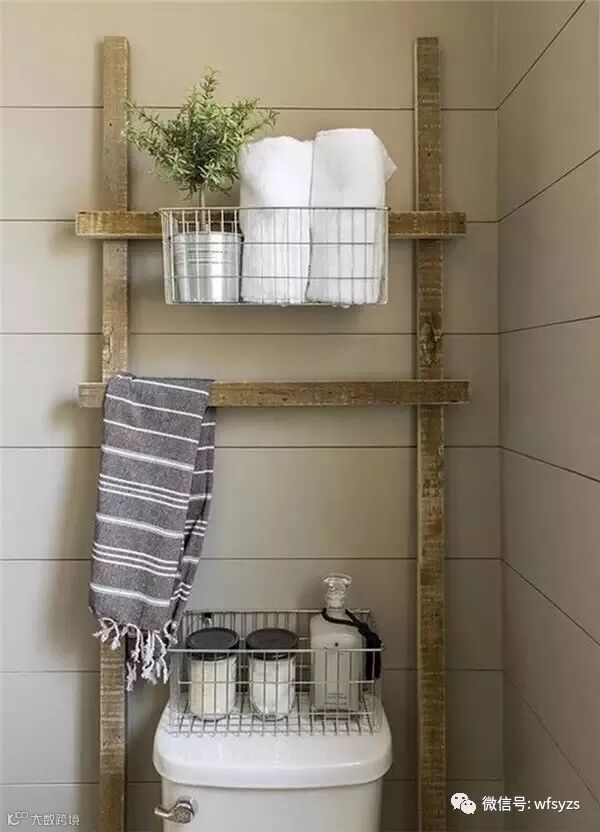 如果你觉得上面都比较麻烦,那么可以选择摆一个小梯子在马桶上方,靠墙安放,不会占用过多的空间,收纳毛巾等很是方便。