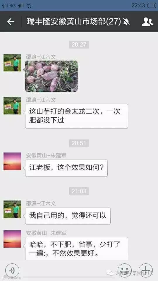 安徽黄山市场部下属的江经理在自己家的山芋田里使用了2次金太龙,完全没有进行追肥,昨日传回的图片可以看出山芋长势良好,块茎均匀,而且江老板讲:不用追肥,省了好大的事情,如果按照说明再喷一次,效果会更好!
