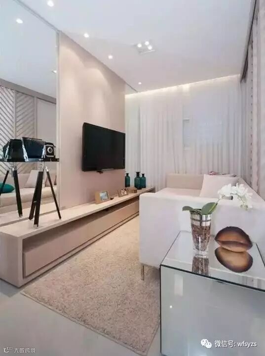 狭长的客厅是小户型常见的结构,可以通过统一空间材质和色调、选择体积较小或者多功能的家具去改造这个不受欢迎的格局,同时还可以适度利用镜面来拉大空间的宽度,但是过多镜面的存在反而容易让人有压抑感,要注意控制。