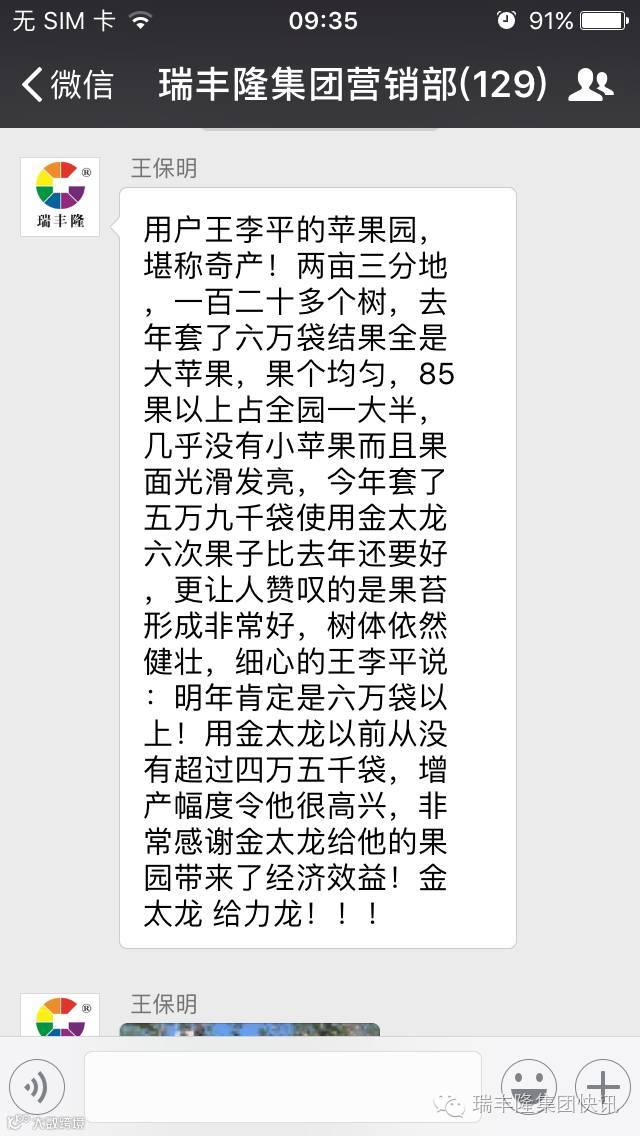 瑞丰隆集团快讯用户王李平的苹果园,堪称奇产!两亩三分地,一百二十多棵树,去年套了六万袋结果全是大苹果,果个儿均匀,85果以上占全园一大半,几乎没有小苹果而且果面光滑发亮,今年套了五万九千袋使用金太龙六次果子比去年还要好,更让人赞叹的是果苔形成非常好,树体依然健壮,细心的王李平说:明年肯定是六万袋以上!用金太龙以前从没有超过四万五千袋,增产幅度令他很高兴,非常感谢金太龙给他的果园带来了经济效益!金太龙!给力龙!