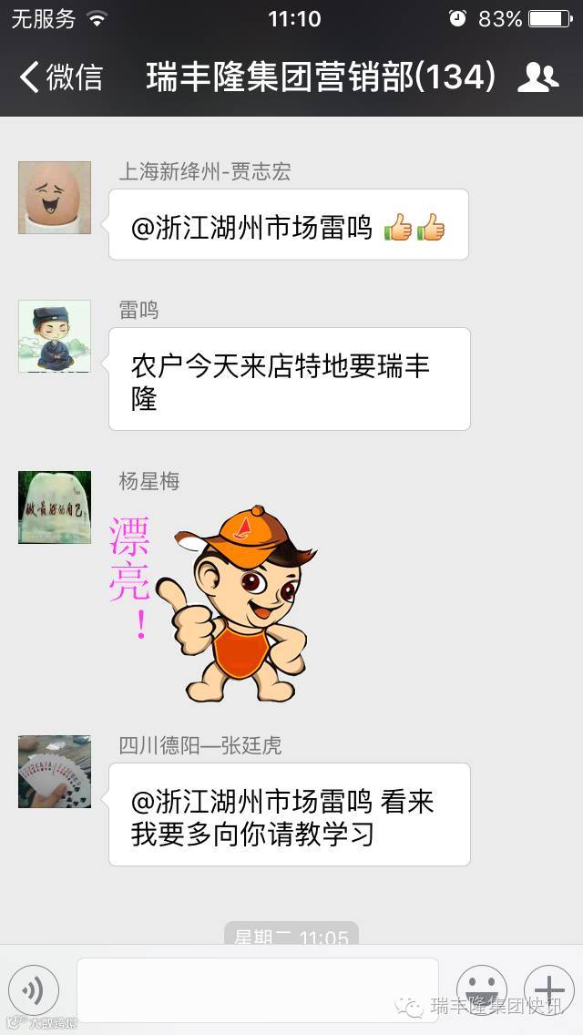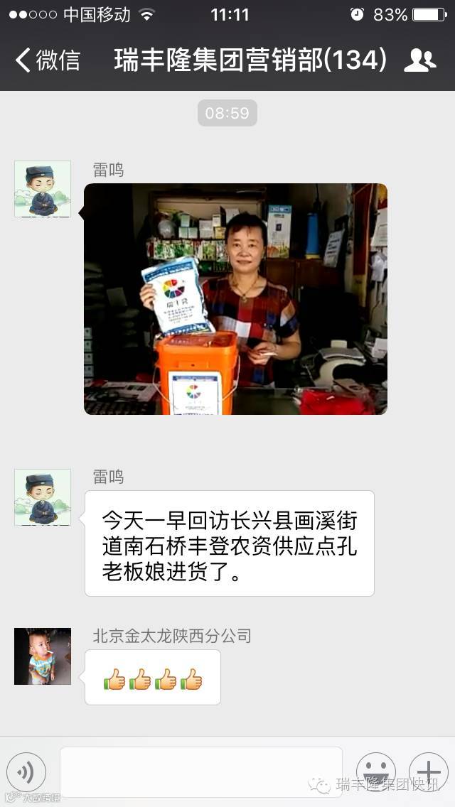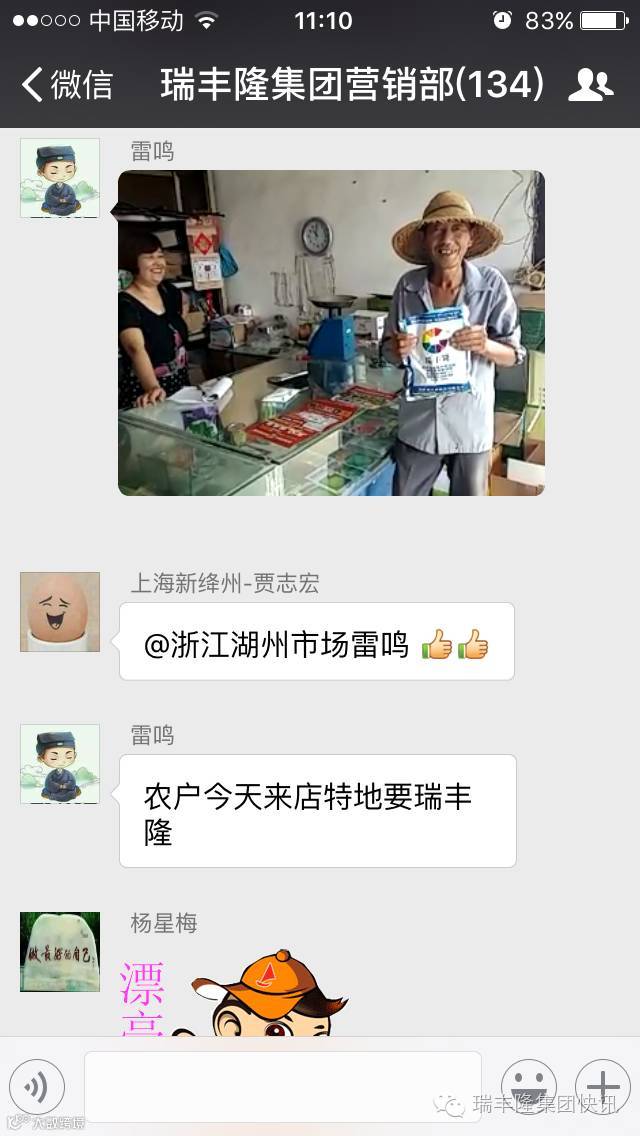 瑞丰隆浙江湖州市场部的雷鸣经理一直是瑞丰隆集团营销群里比较有自我销售技巧和思路的业务经理之一,他学习农业知识,根据用户的种植作物及生长的实际情况配合用户使用喷施瑞丰隆,和用户交心,帮助用户解决最实际问题,也许这就是浙江湖州市场部短时间里营销给力、喜迎回头客的巧妙之处。