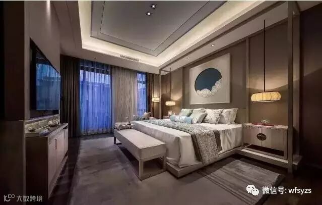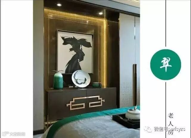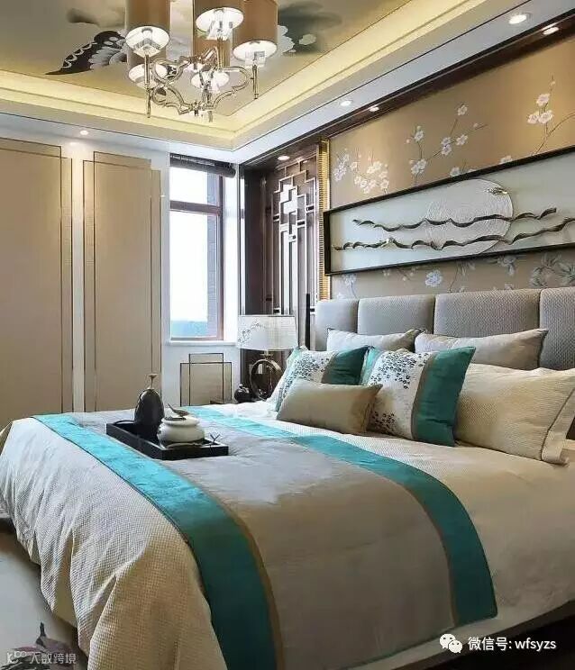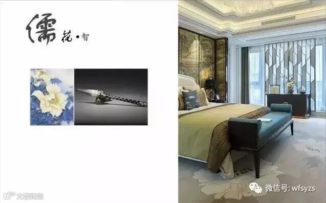 三楼主卧中最抢眼的莫过于墙面背景帝城与牡丹的图案,素有国花之称的牡丹代表富贵,有容纳天下的雍容气度。并于花开花落的自然规律中悟中国文化,巧妙地表达了“知进退、明舍得”的东方智慧。