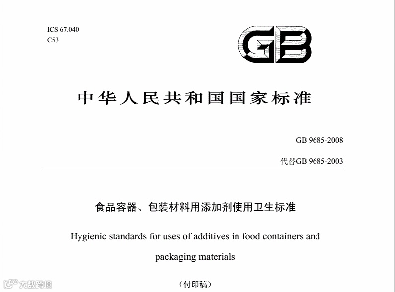 由中华人民共和国卫生部、中国国家标准化管理委员会发布的《食品容器、包装材料用添加剂使用卫生标准》。最初发布于2003年,在起草初期也借鉴了美国FDA以及欧盟2002/72/EC等标准中的允许化学物质目录。在近两年内,GB9685的执行愈发严格,越来越多的胶粘剂厂家开始关注GB9685。