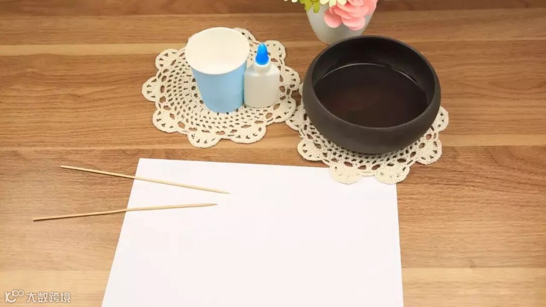 白乳胶、水、一次性杯子、杯垫、碗、竹签(可用筷子或玻璃棒代替)、A4纸