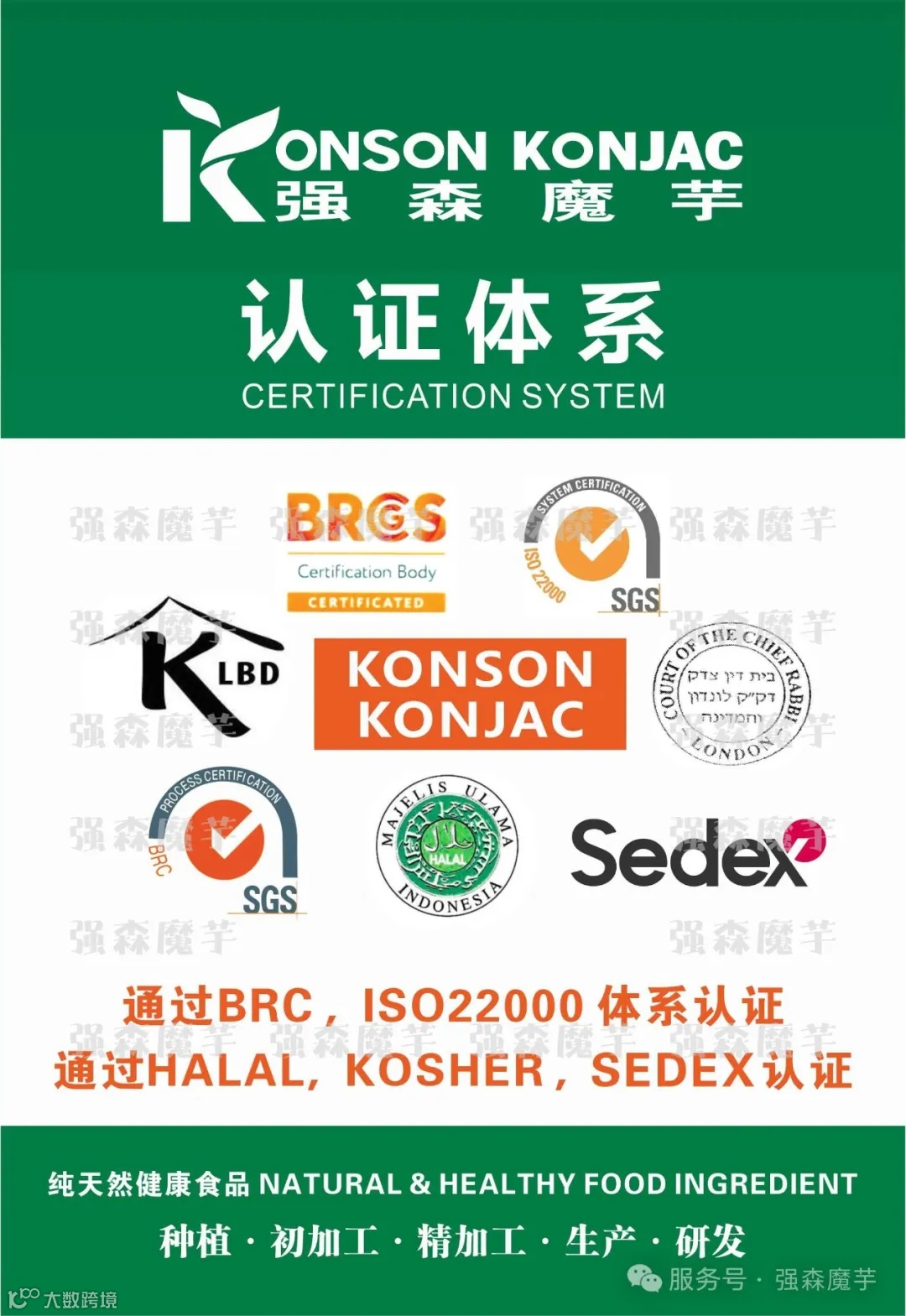 产品和服务质量是公司发展最大的保证,这得益于公司完善的管理体制。鄂州工厂先后通过了ISO22000:2018、BRC9.0、KOSHER、SEDEX和MUI HALAL认证,并通过了美国FDA注册。是国内首家获得BRC英国零售行业全球食品安全标准认证的魔芋企业。