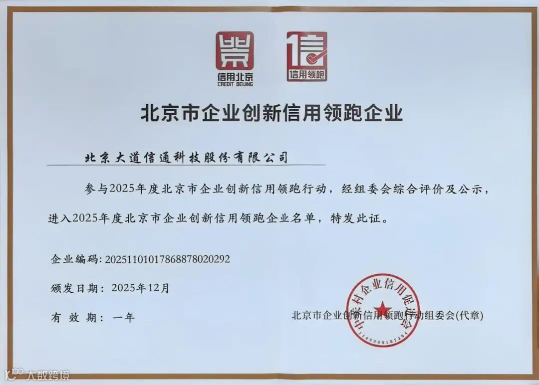 在本次论坛发布的“北京市企业创新信用领跑名单”中,大道信通成功入选,以卓越的创新能力、规范的信用体系建设、长期的稳定运营能力,获得大会重点认可。