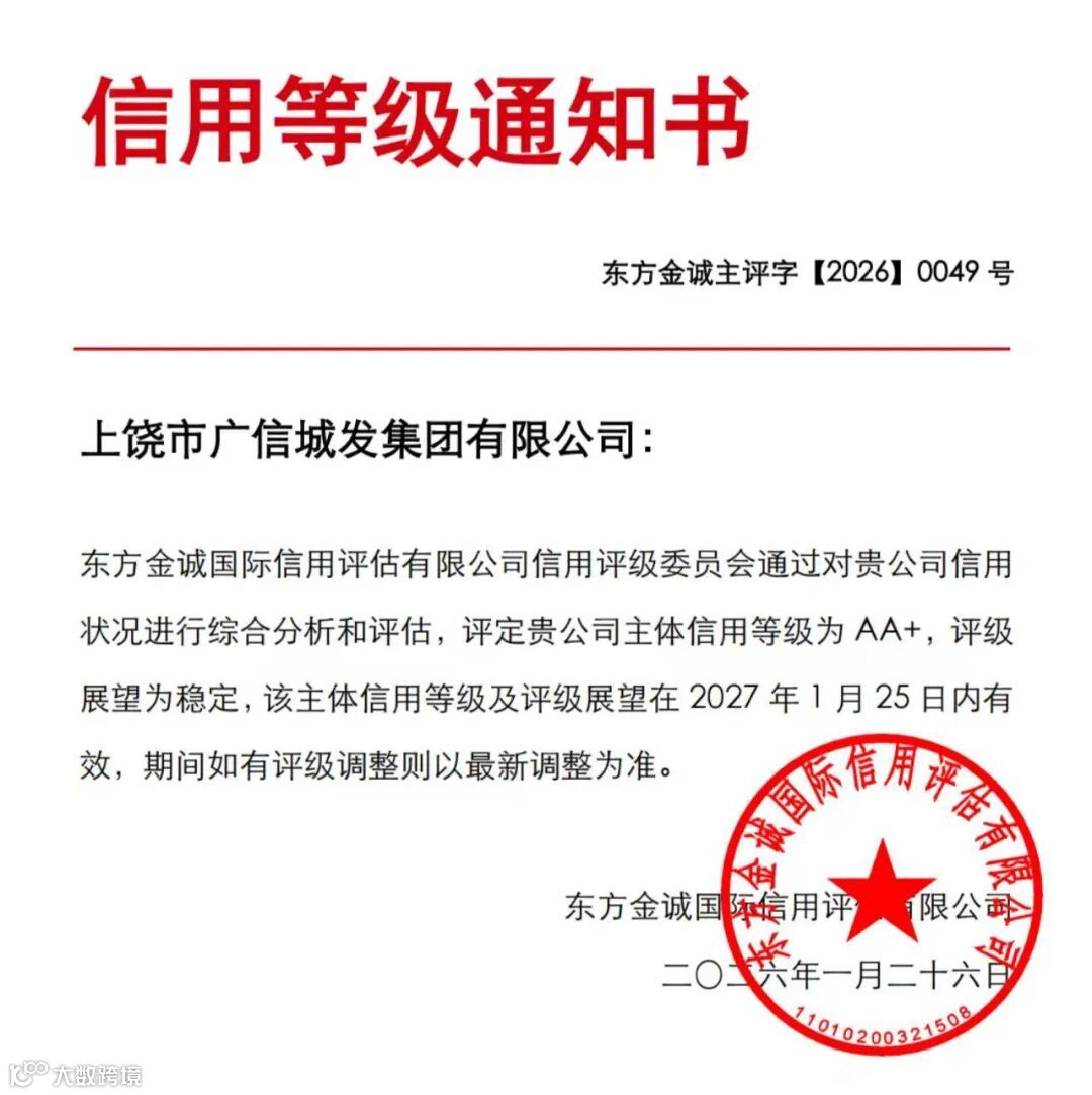 2026年1月26日,从东方金诚国际信用评估有限公司传来喜讯,上饶市广信城发集团有限公司的主体信用等级被评定为AA+,评级展望为稳定。