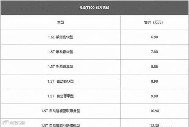 本次众泰T500共推出两种动力组合共7种车型,指导价在6.98—12.38万元。刷新同级别车型价格新低,推动自主品牌智能车的发展。
