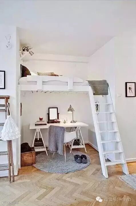 一个人,一张小床和一个小工作台,既可以读书办公,又能当梳妆台,这样的设计简单又时尚。