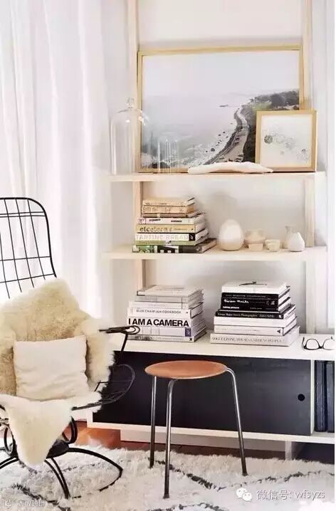 一层层简单的木板,钉在墙上就成了置物架,解决了房间小,物品没地方放的问题。