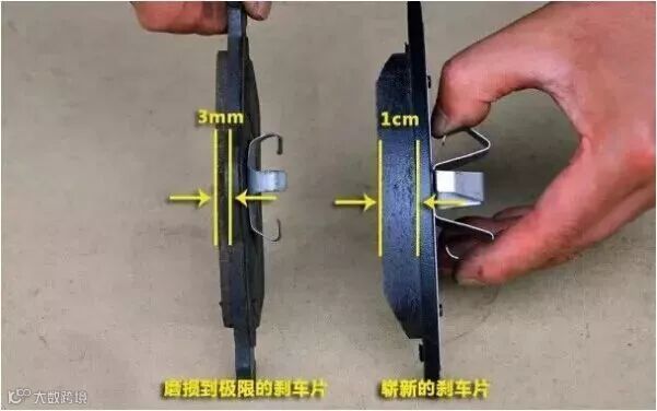和轮胎一样,刹车片上同样有磨损极限,一般正常的刹车片厚度是1cm,若果少于5mm就要考虑更换,不能低于3mm。
