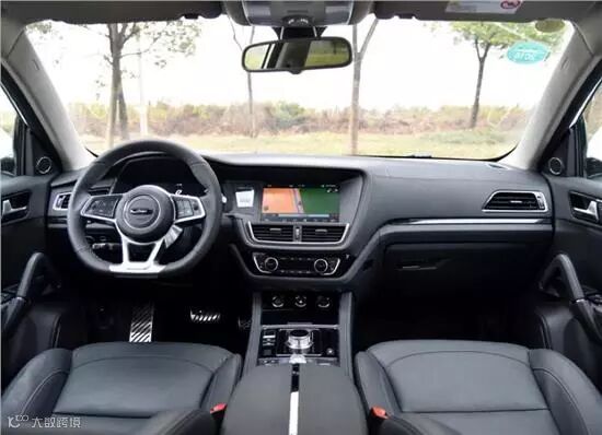 众泰T600内饰整体风格偏向驾驶员一侧,采用了全黑配色,中控台则是内嵌式触摸屏设计,极富运动感。全新设计的旋钮式换挡杆、三幅式皮质平底方向盘加上经过优化的空调出风口、拉手等位置,提升了车内的质感。