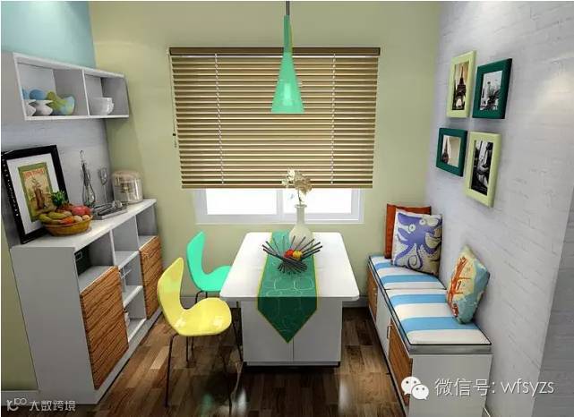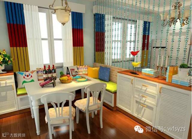 喜欢家里热闹的,配合一些色彩缤纷的饰品,如抱枕、窗帘、软坐垫等,整个餐厅就有种欢乐的感觉。