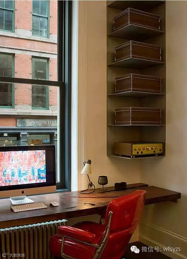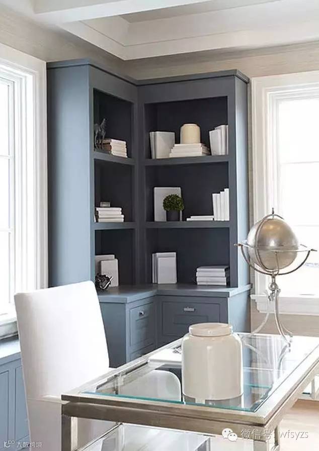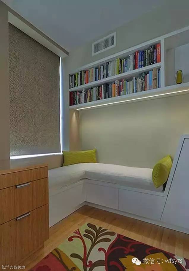 狭小的空间若是没有地儿安放书架,那就在墙角安置一个。而对于家具进行转角设计,是攻克墙角旮旯的最棒方法,看,紧贴的着墙角的部分被白色转角书架填满,在这儿,就可以收纳一定量的书籍。