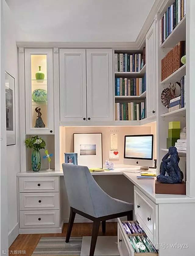 小户型之家的家庭工作室,想必不会太大,但我们可以做到精致。定做的白色整体书柜,有着大大收纳空间,最最妙的还是转角部分的书架设计,不仅可以多争取几本书的空间,而且能让正下方正在工作的家人更为便捷。