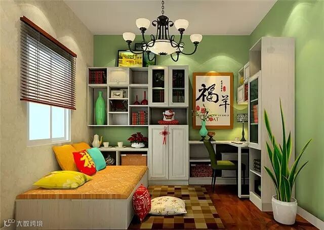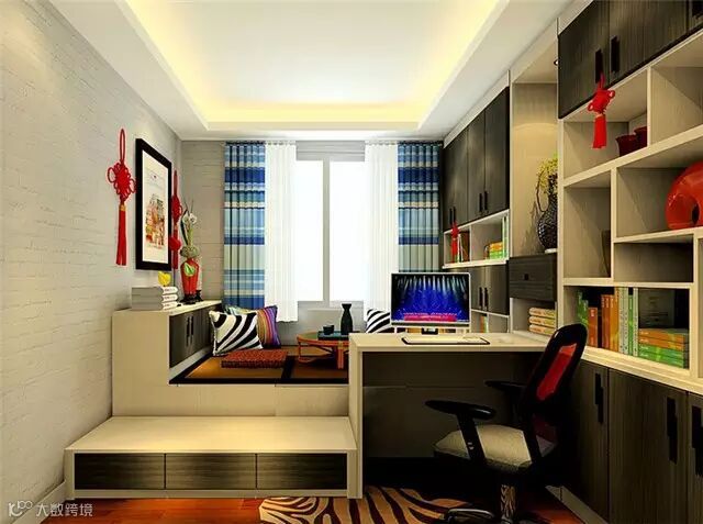 书房在榻榻米上放置矮柜使其用起来更加方便,转角柜与矮柜的拼搭使之更加协调的衔接起来,吊柜与书桌的设计,使办公起来更加方便。与朋友聊聊天、看看书、喝喝茶,都是非常惬意的事。