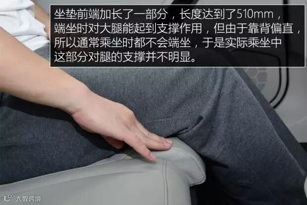 至于前后排的舒适性,前排扶手箱可以调节高度,不同身材的驾驶员可以找到合适的位置。后排坐垫特意进行了加长处理,可是后排靠背的角度比较小,靠背偏直,使人处在端坐的状态,这种状态并不舒服,所以大多人乘坐时身体都会向前滑一点,正是这个原因,座椅加长的这一段对于大腿的实际支撑效果不错。
