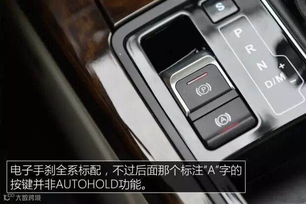 电子手刹为全系标配,后面标识字母“A”的按键通常来说都是AUTOHOLD,但在众泰Z700上并不是。一般带有电子手刹的车型在系好安全带的情况下挂入D挡踩油门,电子手刹会自动松开,这台车如果不激活后面字母“A”的按键,踩油门电子手刹是不会自动松开的,也就是说这个按键代表的意思不是AUTOHOLD而是自动松手刹。电子手刹后面为方形小储物盒,尺寸不大,可以放些硬币、打火机之类的物品。