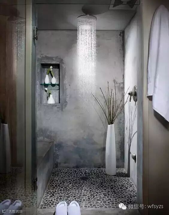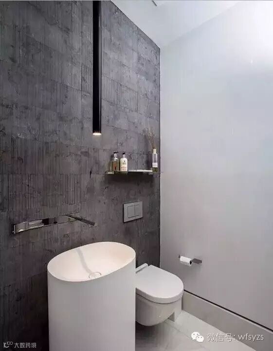 水泥背景墙设计为卫浴空间增添了几分工业气息和厚重感,打破了常规的设计手法。在这样的空间里,你可以尽情裸奔,释放快乐。