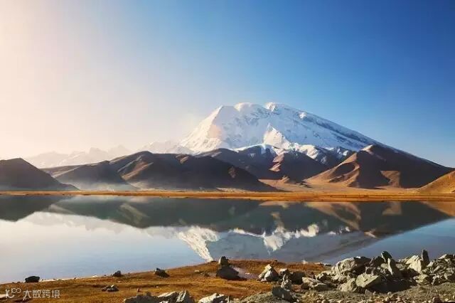 衬托着冰山的神圣和纯美的是卡拉库里湖,湖面海拔3600 米,深30 米,是一座高山冰蚀冰碛湖。由于冰山雪峰的反衬,水色呈深蓝偏黑,也被称为“黑海”。