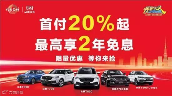 “众享零息 泰划算”即日起,购众泰T300、众泰T700、众泰T800、众泰Z700系列、众泰T600Coupe即可专享“首付20%,贷3免2”与“首付40%,贷2免2”优惠!