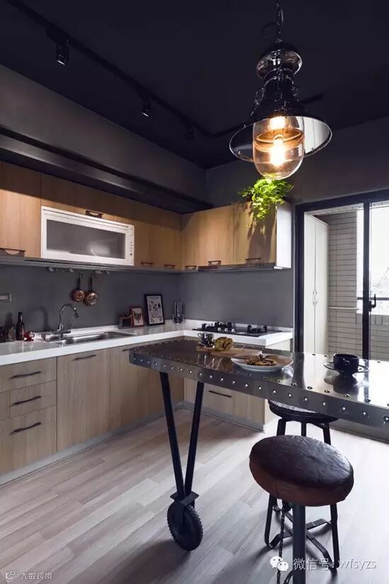 L形的操作台,将转角空间给充分的利用了起来,留给屋主充分的烹饪空间,操作台下方的多层抽屉及对开门收纳柜设计,可以将锅具等隐藏在里面,保证厨房的整洁。在这个小小的厨房空间了,又出现了一样工业风的元素,那就是吧台上方悬挂着的散发出昏黄灯光的裸露灯泡,这是一件很有味道的装饰。