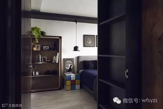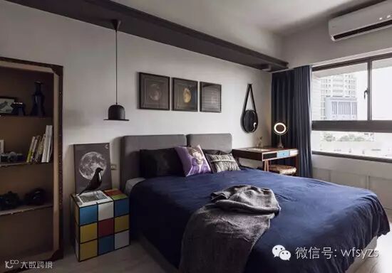 彩色魔方式的床头柜,点亮了卧室空间的激情,礼帽状的床头吊灯,透露出一丝雅痞的意味。