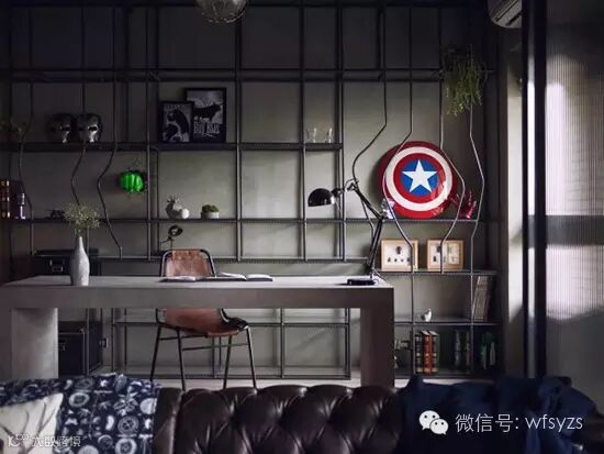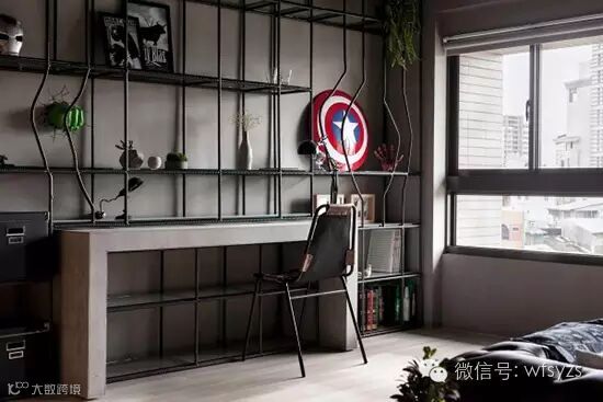 水泥灰的书桌,造型简单,线条硬朗。书房的墙面置物架非常的有创意,由金属水管拼接而成,横横竖竖,占据了整片的墙面,很少见到这样的装修方式,而它的使用功能有多强大就不用小编我多说了,光是看着这些分隔出来的大大小小的格子,就知道可以收纳多少东西了。